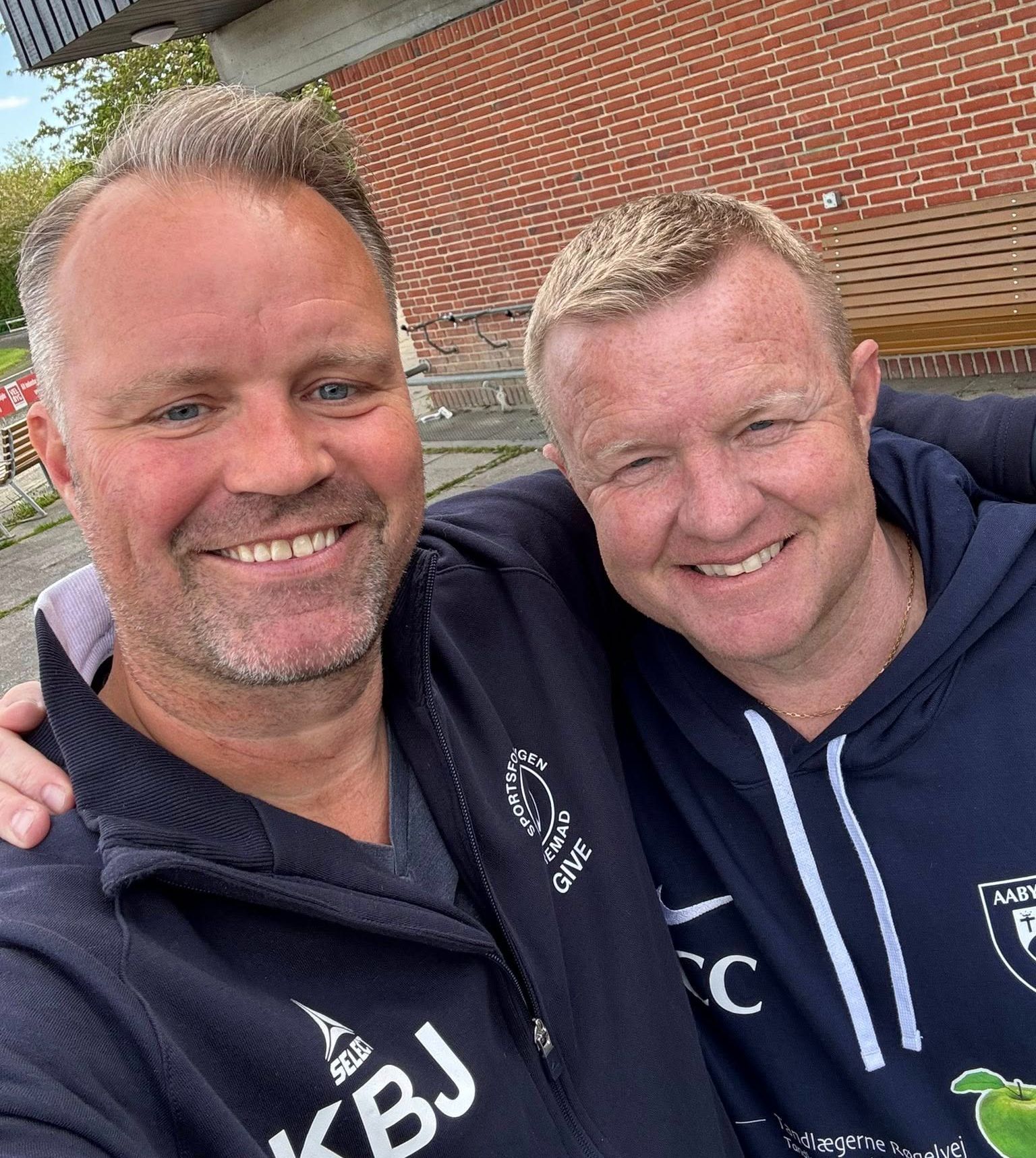 Kasper Bach-Jensen har tidligere haft Claus Christensen, Åbyhøjs træner, som træner i FC Skanderborg i sin aktive karriere, og de to herrer, lærlingen og mesteren, mødtes så face to face fredag aften i det hæsblæsende 3-3 opgør på Åbyhøj Stadion. Herligt med den slags fodboldvenskaber. Foto: Kasper Bach-Jensen