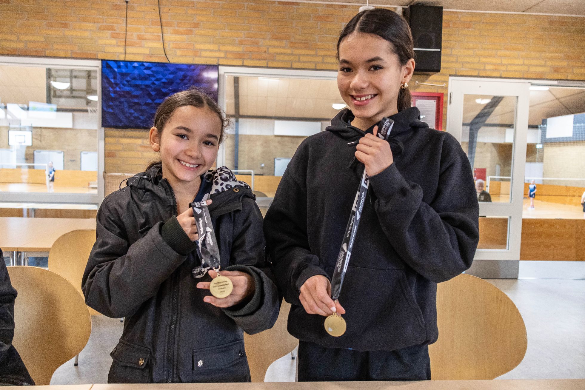 Mithi og Milea viser her den allerførste medalje, de vandt ved et stævne i 2024. Og den er naturligvis af guld.Foto: Jim Hoff