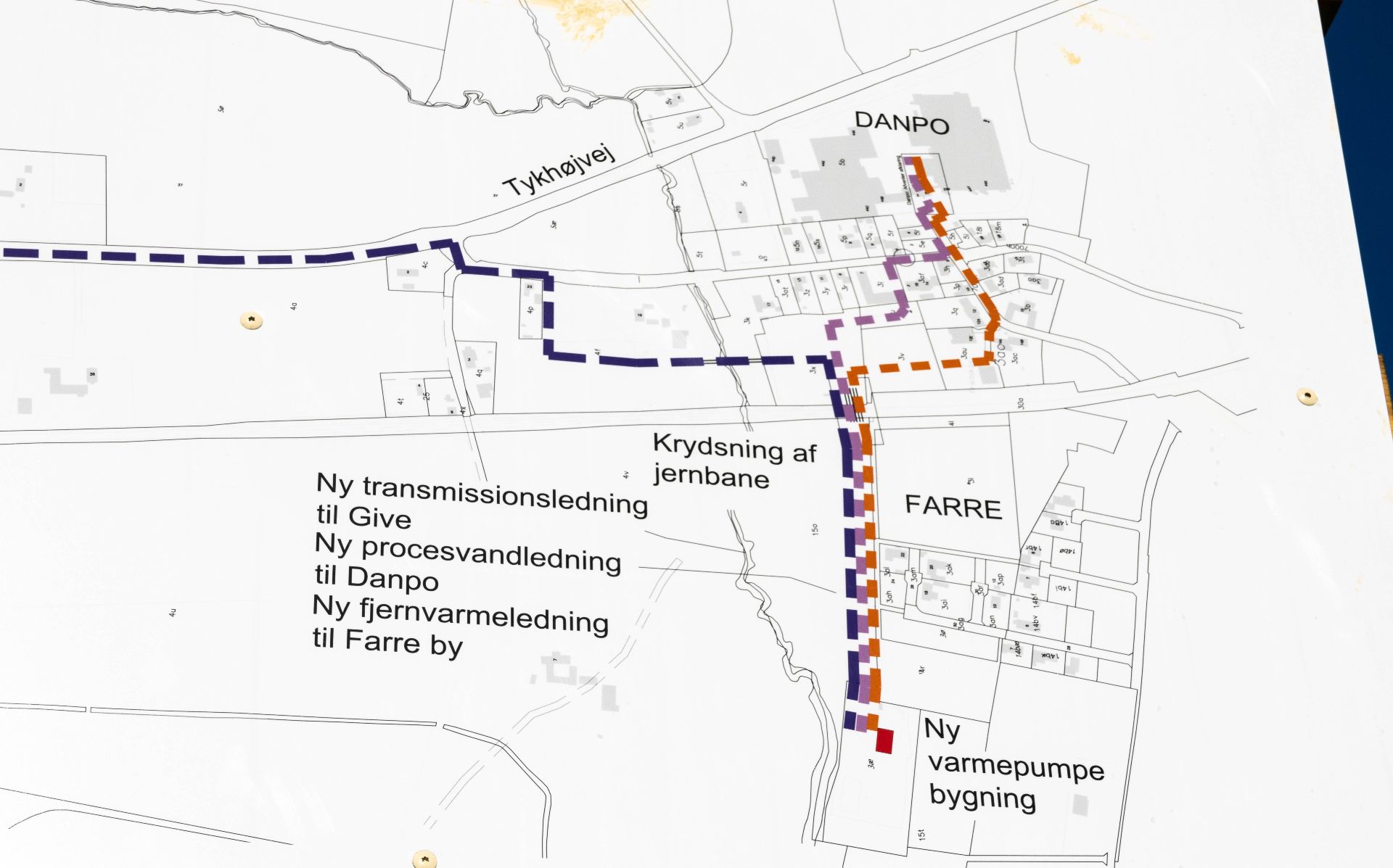 Her et overblik over hvordan rørføringen kommer til at gå i Farre. Kort: Give Fjernvarme