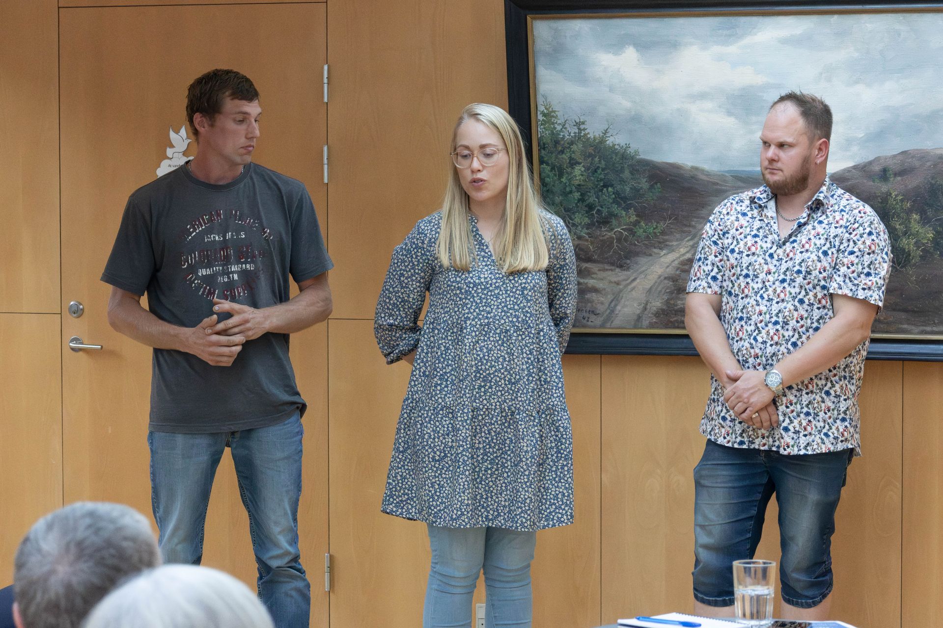 Tre forældre fra gruppen "Bevar SFO'en i Give som den er" med Line Møller Schultz i spidsen fortalte om deres frustrationer om ikke at være blevet hørt i sagen om SFO-flytningen - inden den var besluttet. Hun er flankeret af Morten Førslev Hviid Andreasen og Anders Drewsen. Foto: Jim Hoff
