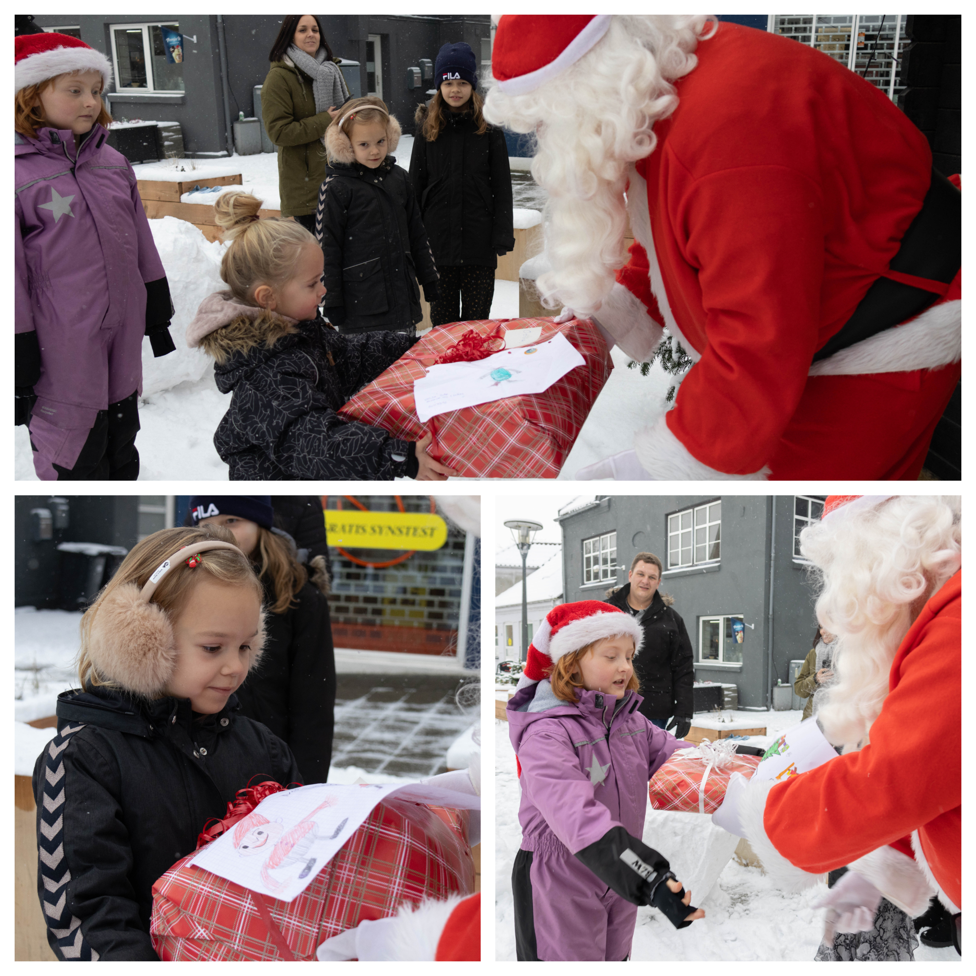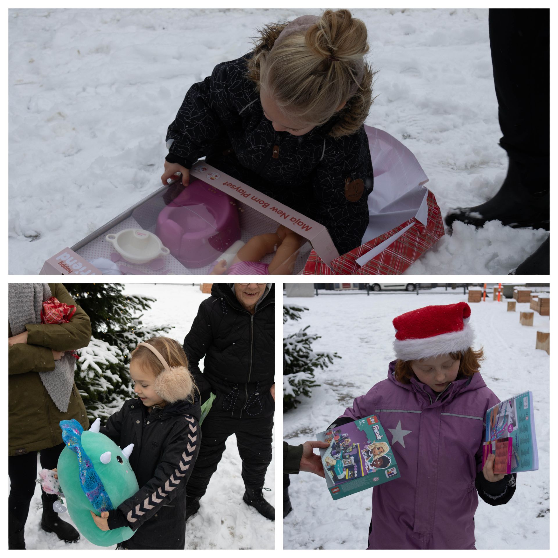 Han havde også sækken fuld af gaver, og de blev uddelt med rund hånd til stor begejstring for de tre friske piger, der med røde kinder og brede smil straks gik i gang med at pakke deres gaver op.