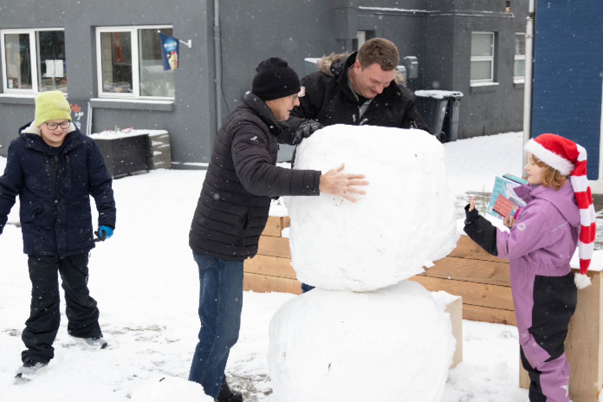 Mens pigerne pakkede op, var Emmas far og lillebror i gang med at lave en stor flot snemand til Torvet, og det lykkedes på bedste vis. Og dermed har den gode julemand pludselig fået selskab nede på Torvet.