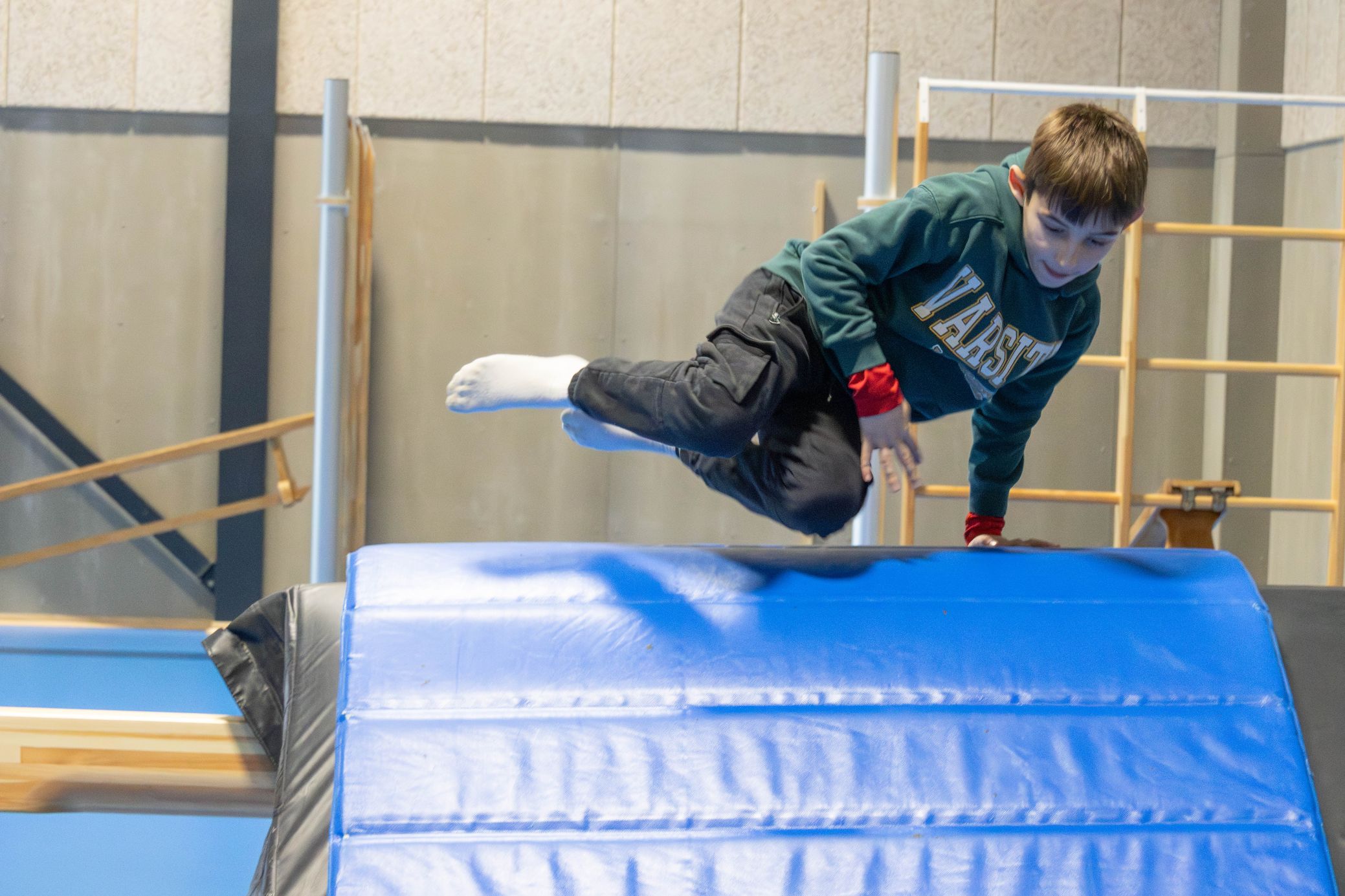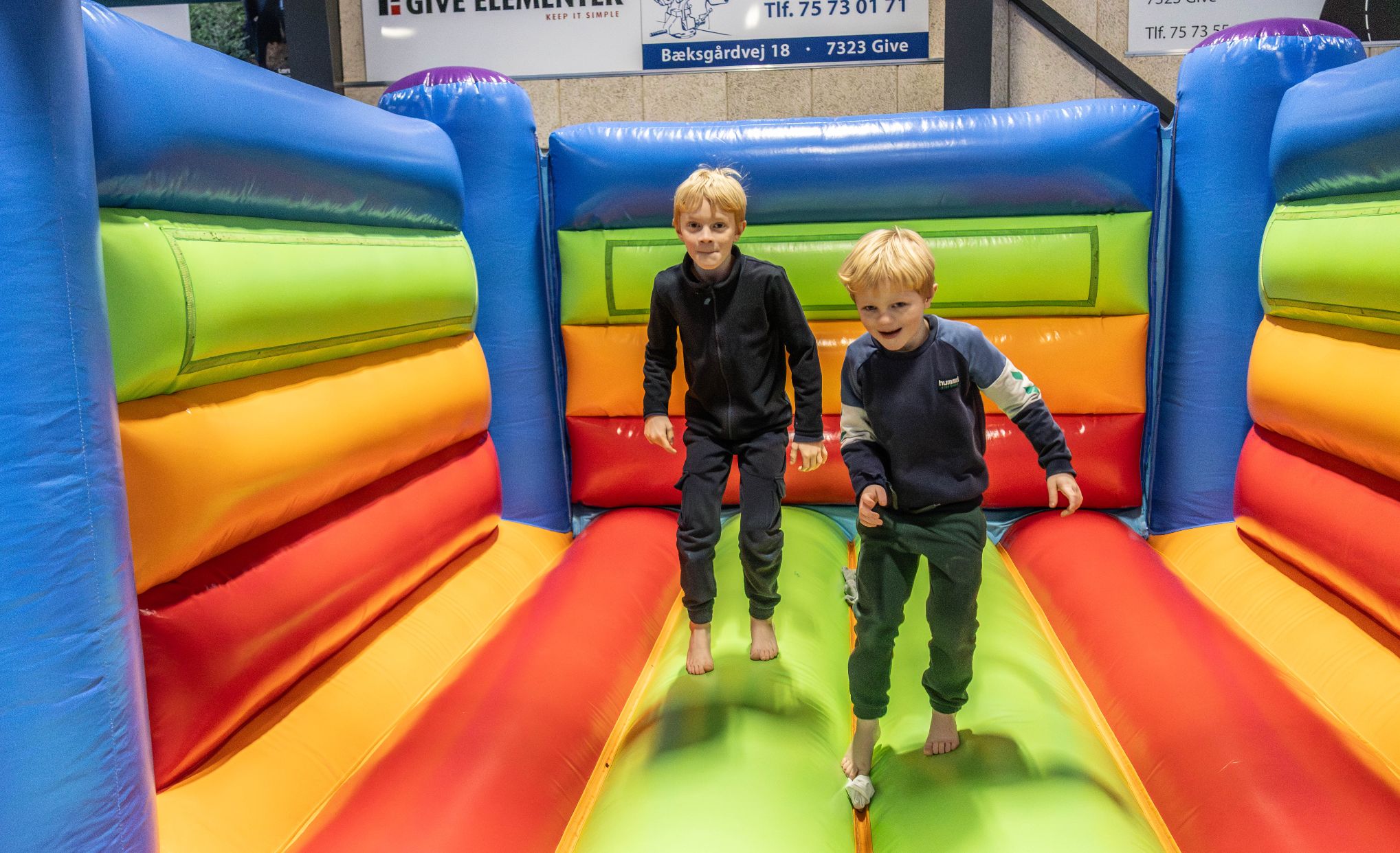 Hoppeborgen og den store springmadras var på plads i den ene af hallerne mandag – og de blev flittigt brugt. Foto: Jim Hoff