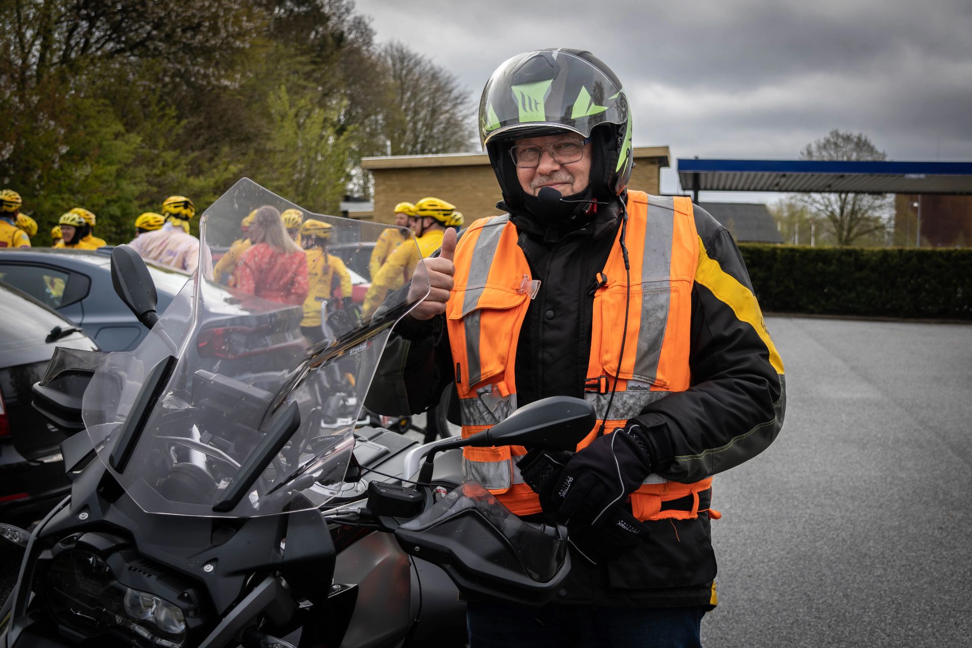 For ligesom at toppe begivenheden havde Torben på dagen skaffet en prominent herre til at stå i spidsen for dagens kortege. Det viser sig nemlig, at det lokale folketingsmedlem, Kenneth Fredslund Ebbesen (DanmarksDemokraterne) er hoppet i læderdragten og på motorcyklen for at guide cykelrytterne sikkert gennem dagens rute.