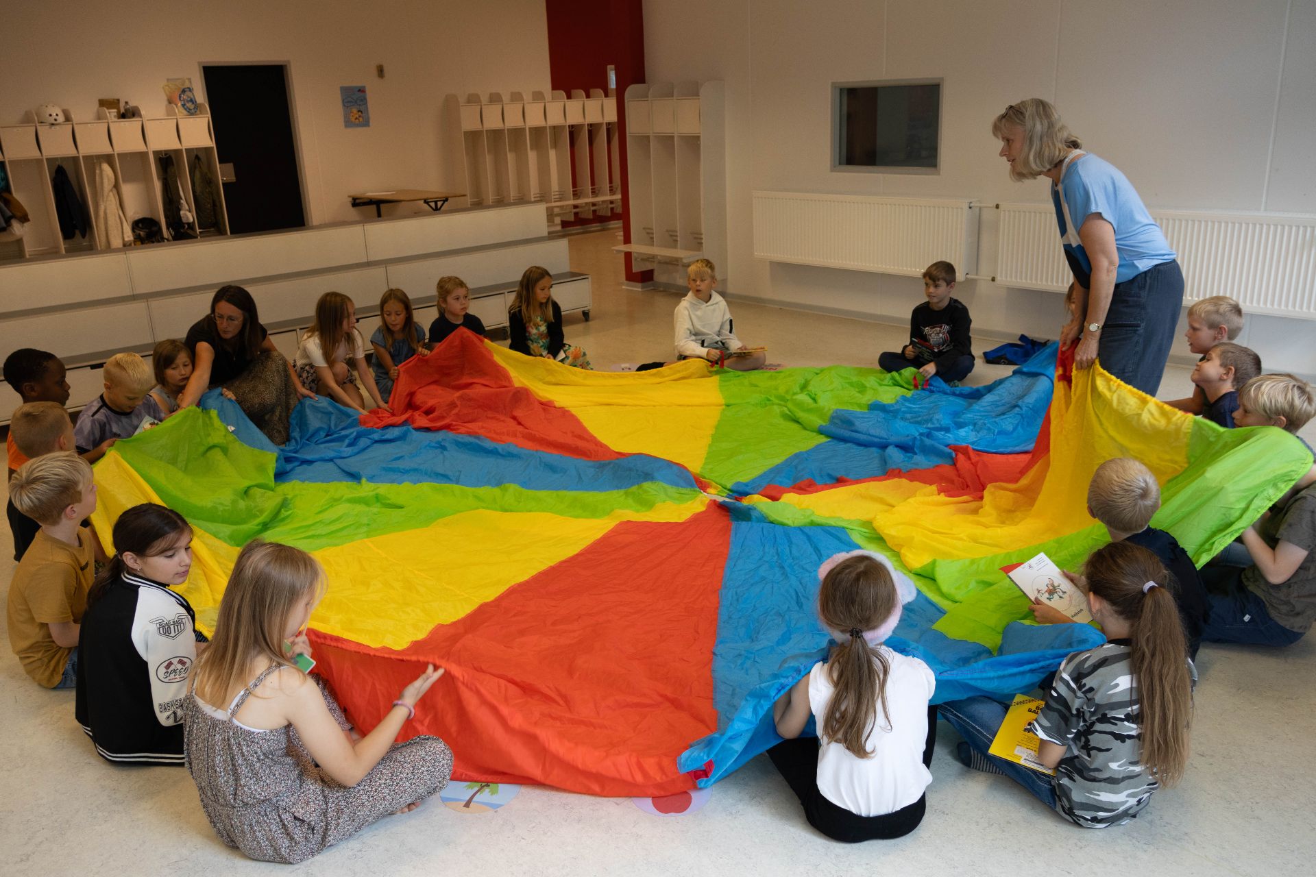 Der stod også faldskærmslæsning på programmet. Her er det børn fra 3. årgang, der går i gang med den finurlige øvelse - og de glæder sig helt vildt. Foto: Jim Hoff