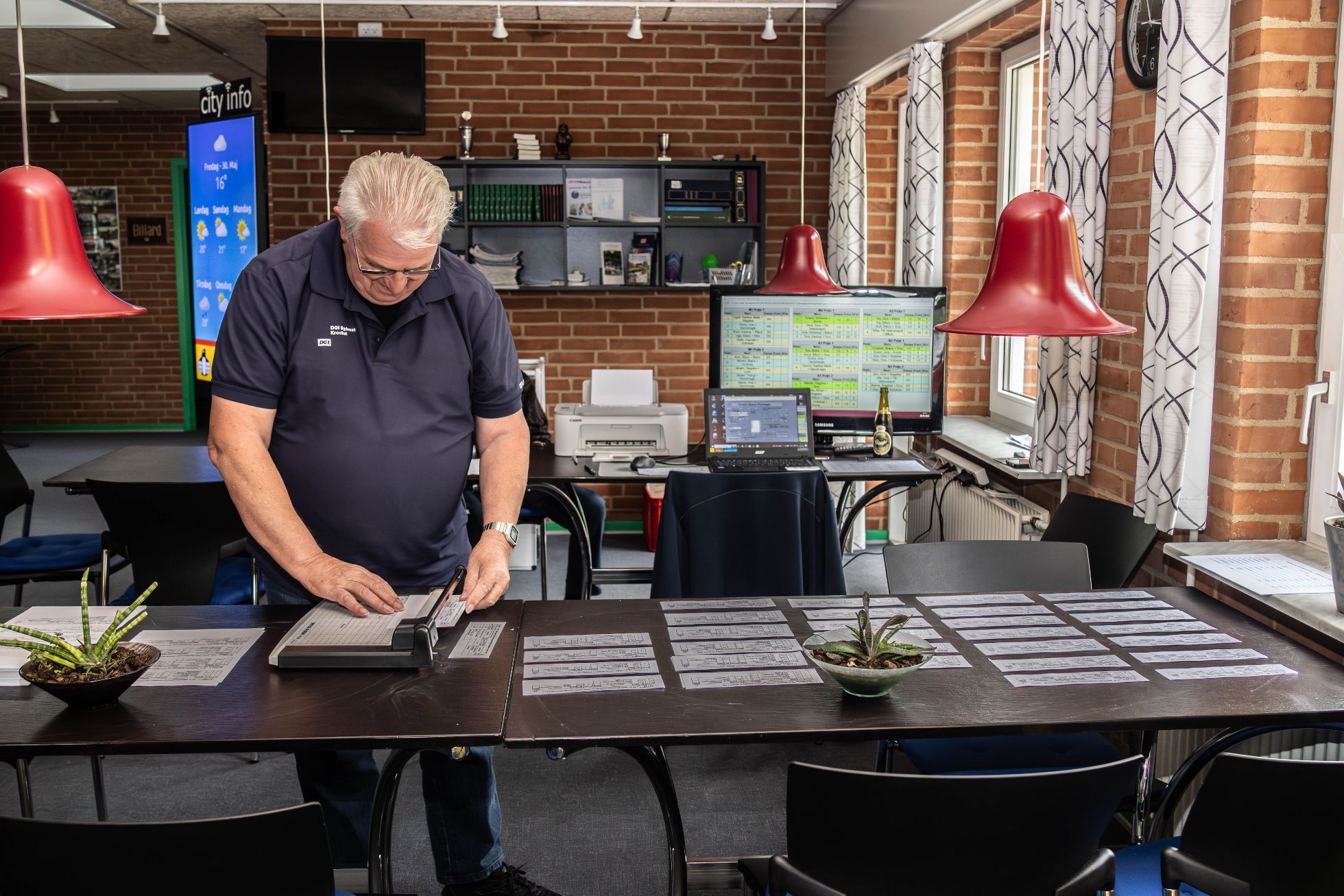 Der er gang i pc’en med program- og kampplanlægning, kampene og holdene printes ud og skæres til og lægges ud på bordet, så spillerne kan se med hvem, mod hvem og hvornår de skal spille.