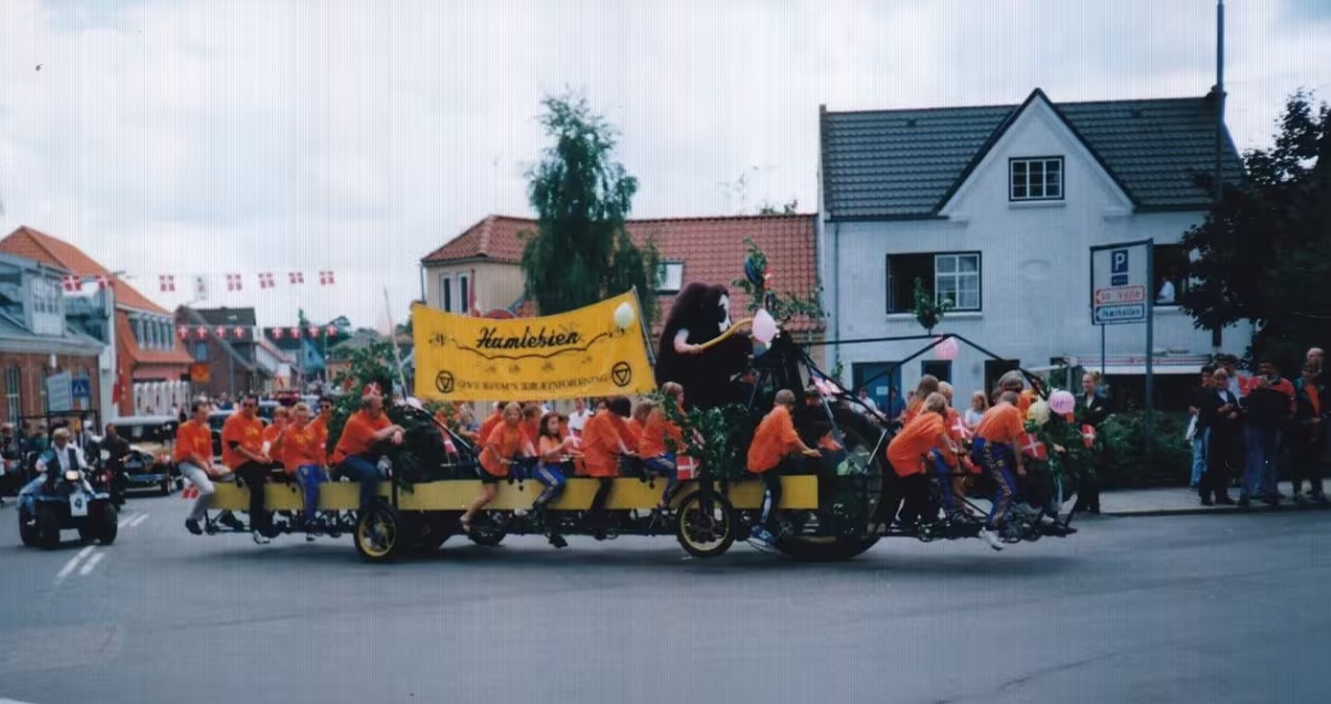 - I 1995 var den lokale håndboldklub Give KFUM (i dag en del af Give HK, red.) værter for EM i KFUM-håndbold, og i den anledning fremstillede man en kæmpecykel med 42 sæder. Den fik navnet ’Humlebien’, selvfølgelig fordi det var et håbløst og svært projekt rent teknisk, og cyklen blev brugt ved Anlægsfesten, hvor 42 mand i gule trøjer kørte i promenade gennem byen og ned i Give Lystanlæg.
