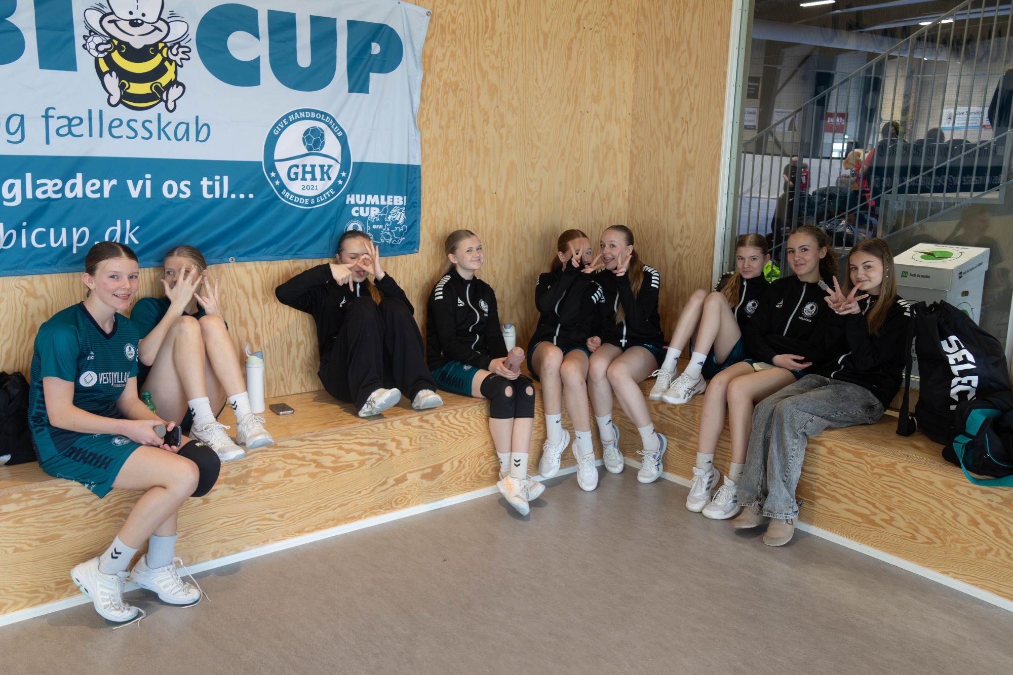 Disse unge damer her er bare så klar til at gå i 'håndboldkrig' - og et par stykker af dem er også ret gode til tegnsprog, som man kan se, smiley! Foto: Jim Hoff