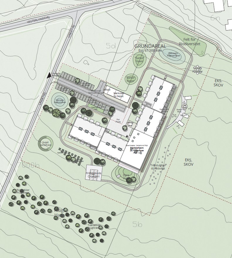 -Der vil blive nogle fløje, der primært skal bruges til boliger og fællesområder, og et indgangsområde med kontorer og teknikrum. Haveanlægget vil rumme et stort orangeri, en smådyrsfold, nyttehave, sansehave, insekthotel og frugttræer. Der vil blive etableret nogle stier, som vil blive koblet på de eksisterende stier som er inde i skoven til gavn for byen.