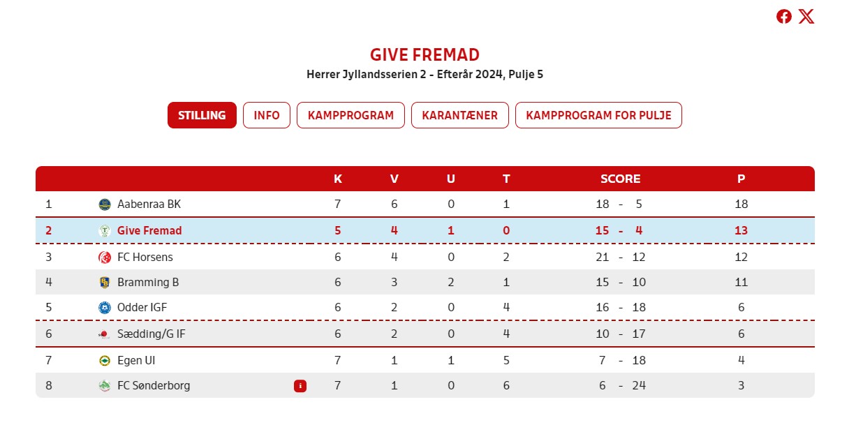 Give spiller næste gang lørdag den 14. september klokken 13.00 – igen på hjemmebane – mod FC Horsens. Det bliver en topkamp mod rækkens nr. 2 fra Give, og rækkens nr. 3 fra Horsens. Du kan se tabellen herunder.