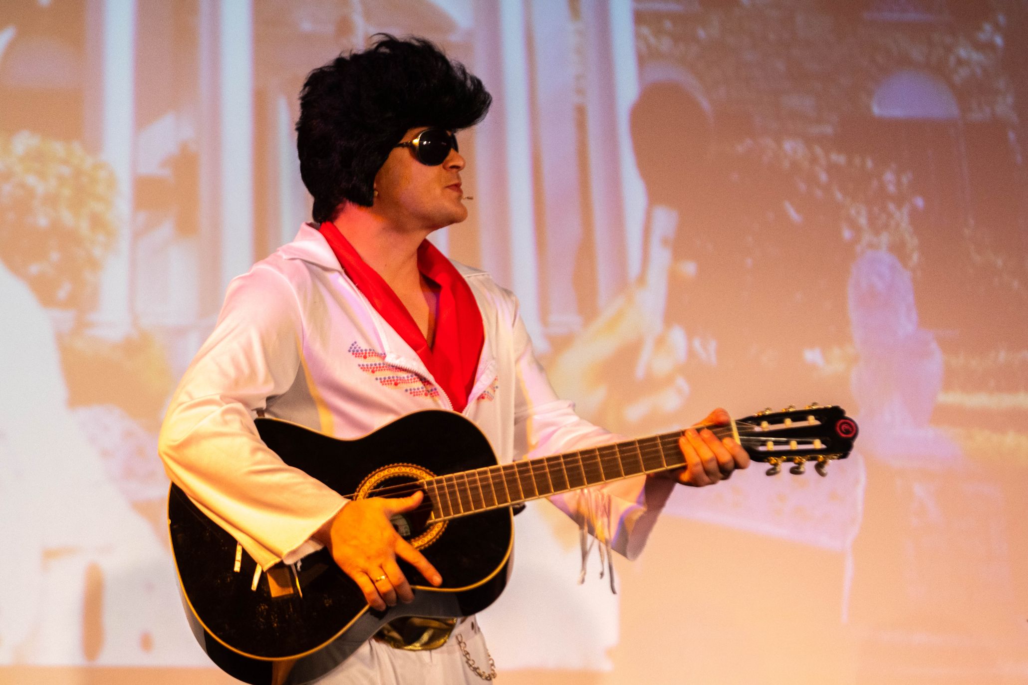 Selveste Elvis Presley indtog scenen, da han lige måtte forklare kong Frederik, hvem er er den eneste sande konge. Foto: Jim Hoff
