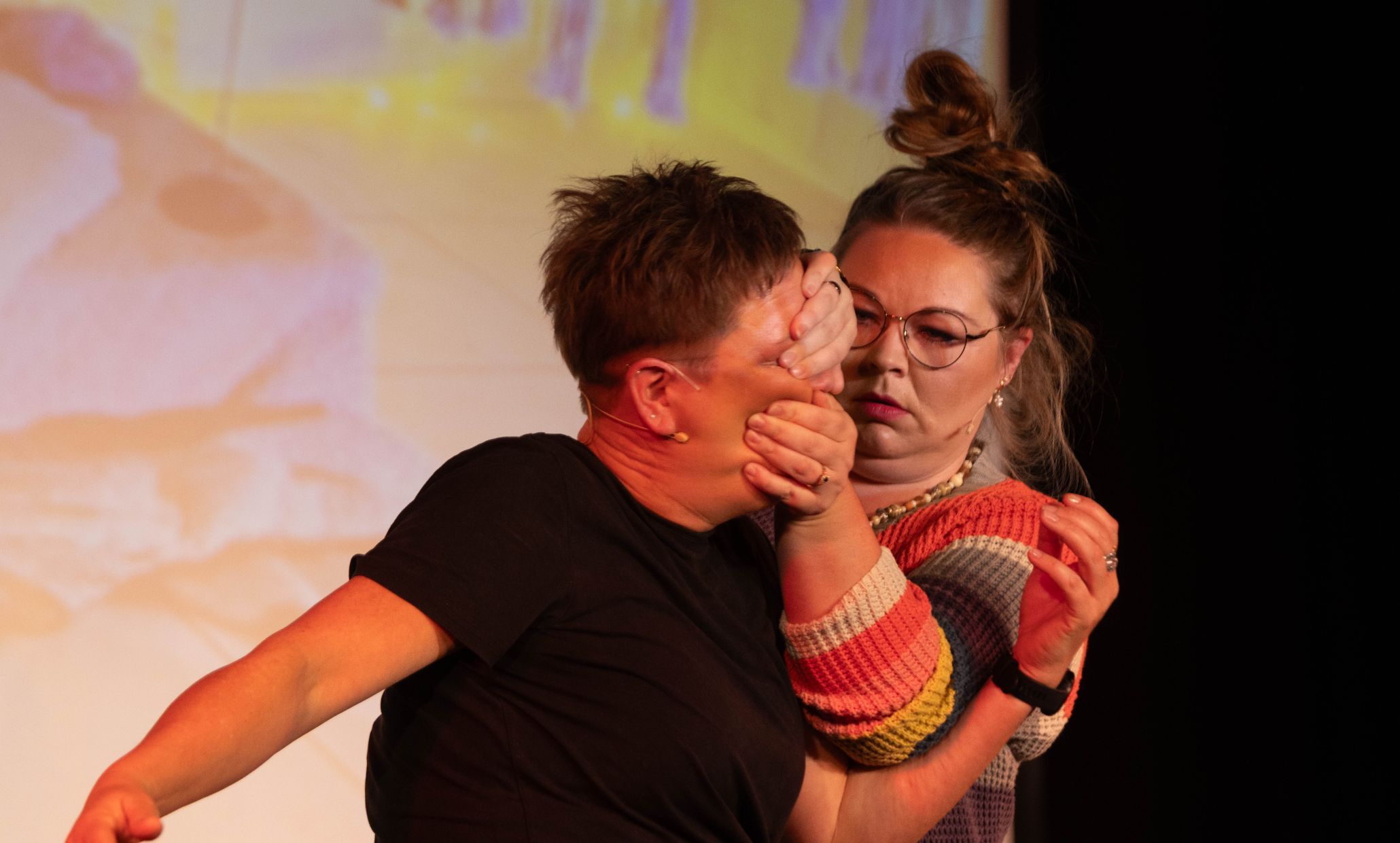 Det var en noget brysk udgave af en healer, som Louise Timmermann kom på scenen med. Her går den hårdhændede spirituelle kærlighed ud over Karina Norlyk. Foto:Jim Hoff