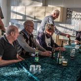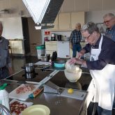 Døren ind til det muntre køkken står åben, og man kan på lang afstand høre muntre herrestemmer ledsaget af røsterne fra to kvinder, der guider dette store husflidsorkester af 12 mænd i den modne alder, der i røg og damp iført forklæder og brede smil er i fuld gang med at lave mad.