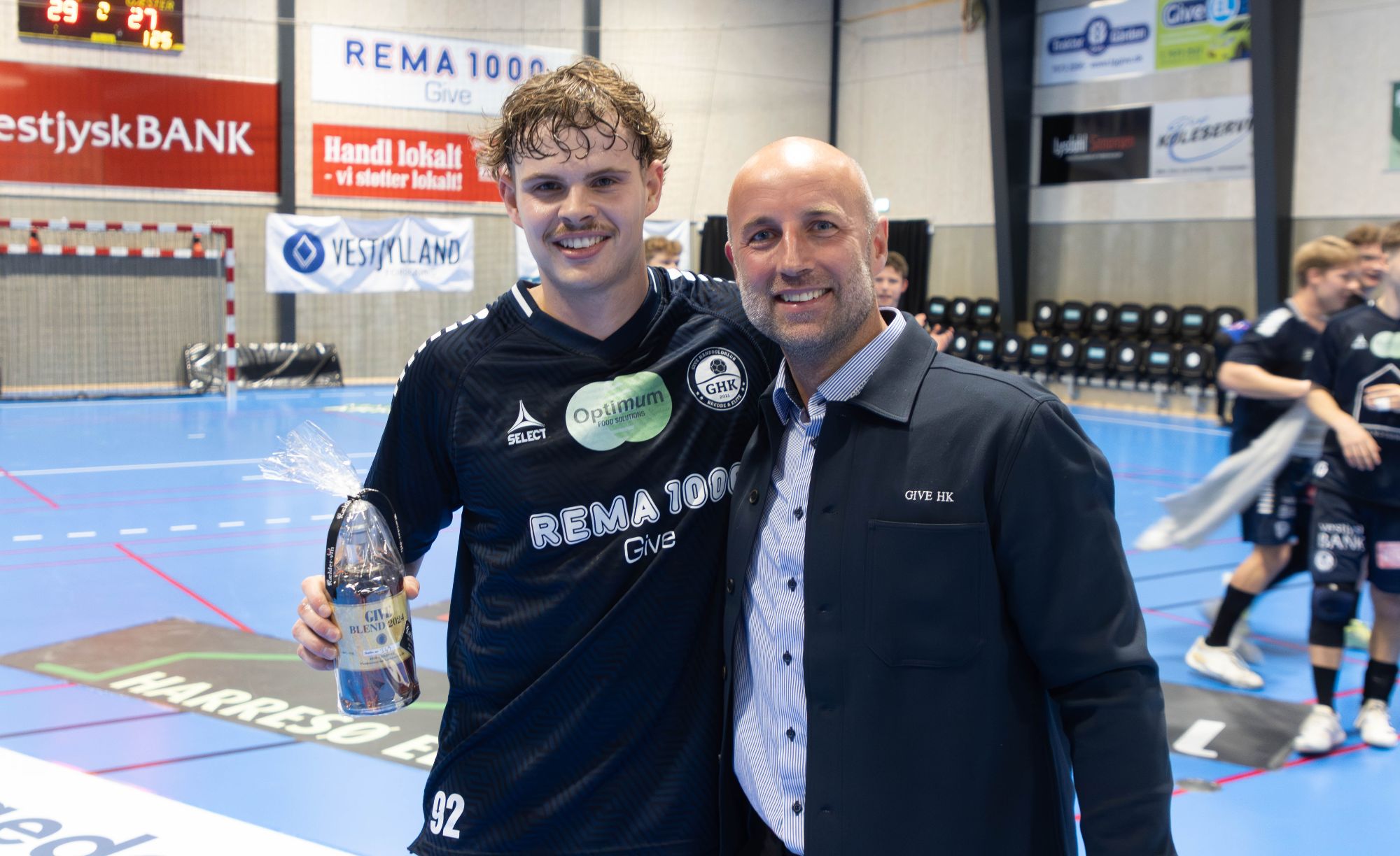 Sune Skovsen ( 4 mål) blev Gives Man of The Match i 29-27 sejren over HC København. Her er det Christian Kaasing fra bestyrelsen der er klar med en gave til den unge mand. Foto: Jim Hoff