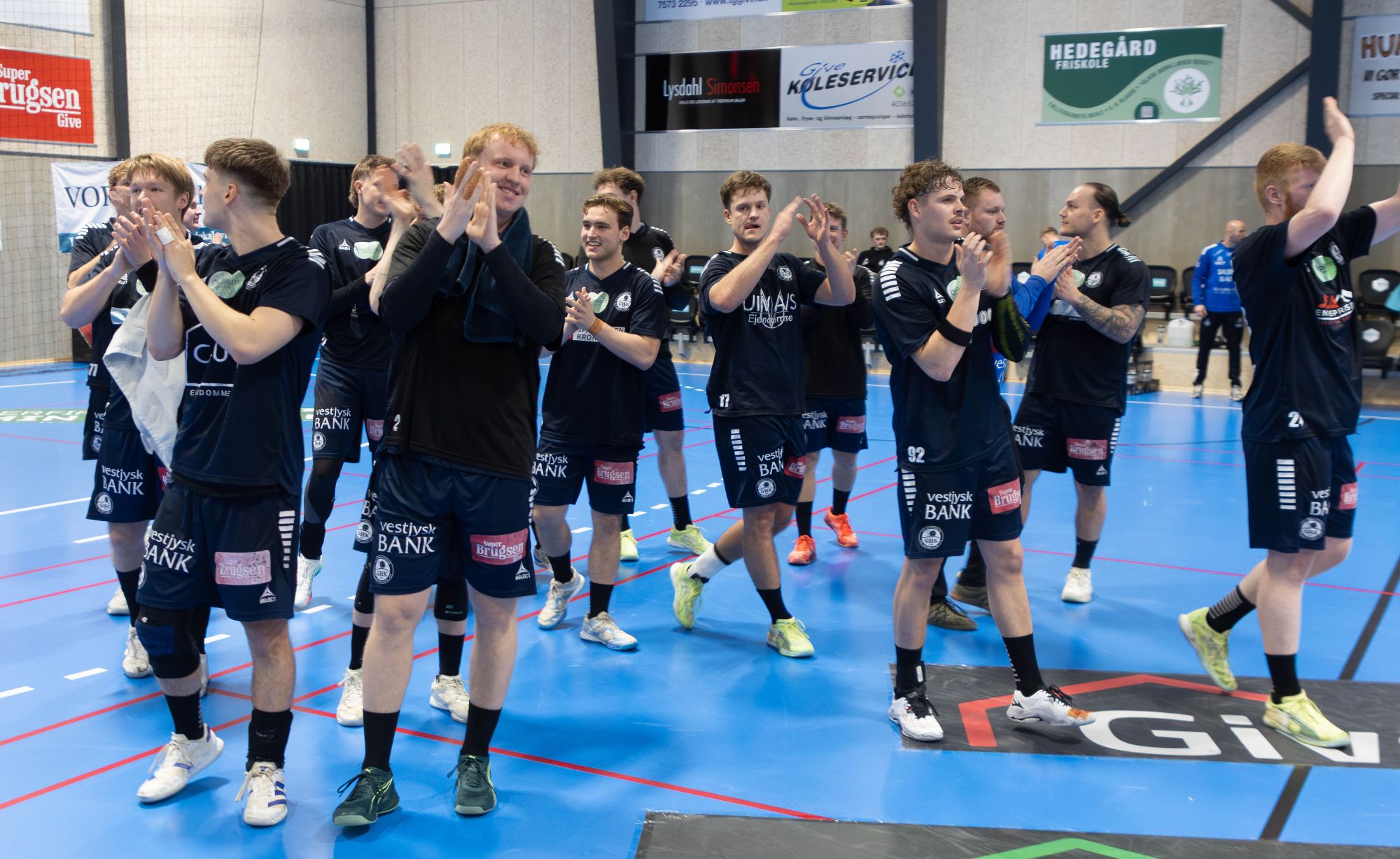 Der var stor glæde i Givelejren efter den forløsende sejr over HC København. Her takker spillerne det entusiastiske publikum lige efter kampen. Foto: Jim Hoff