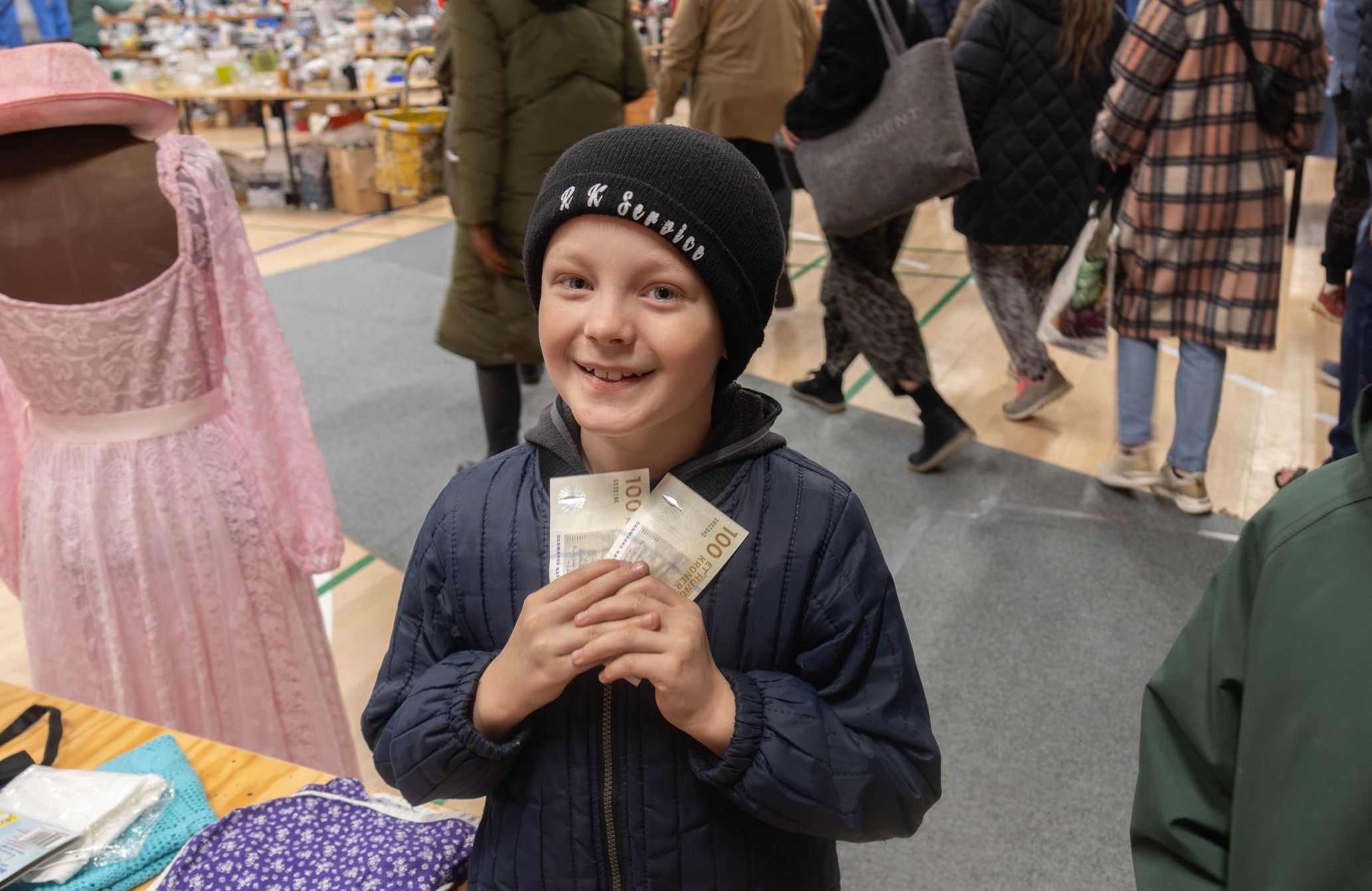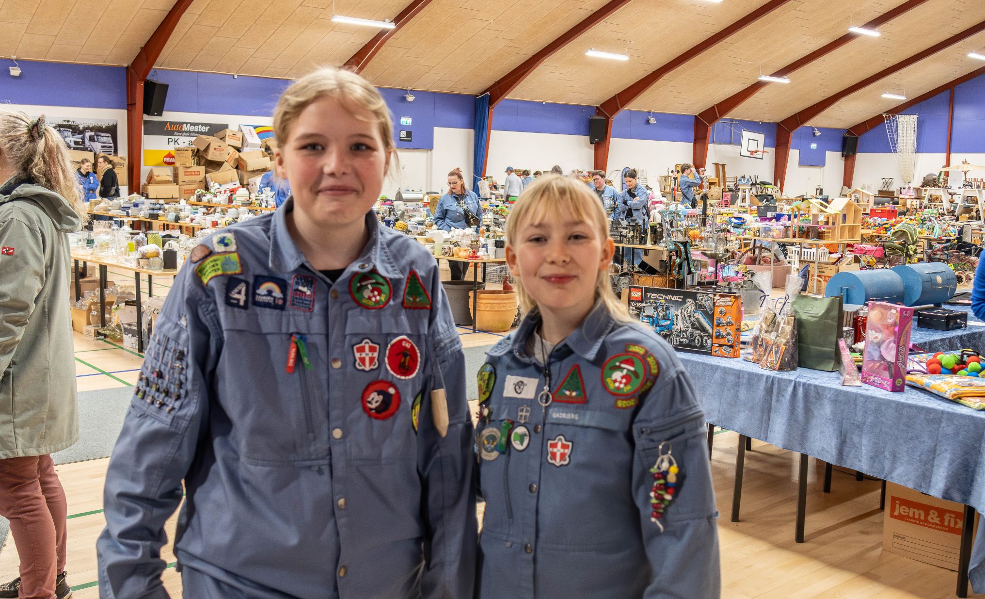 Bedre og mere sød velkomstkomité finder man næppe, når man drøner ind til et loppemarked i en stor sportshal. Foto: Jim Hoff