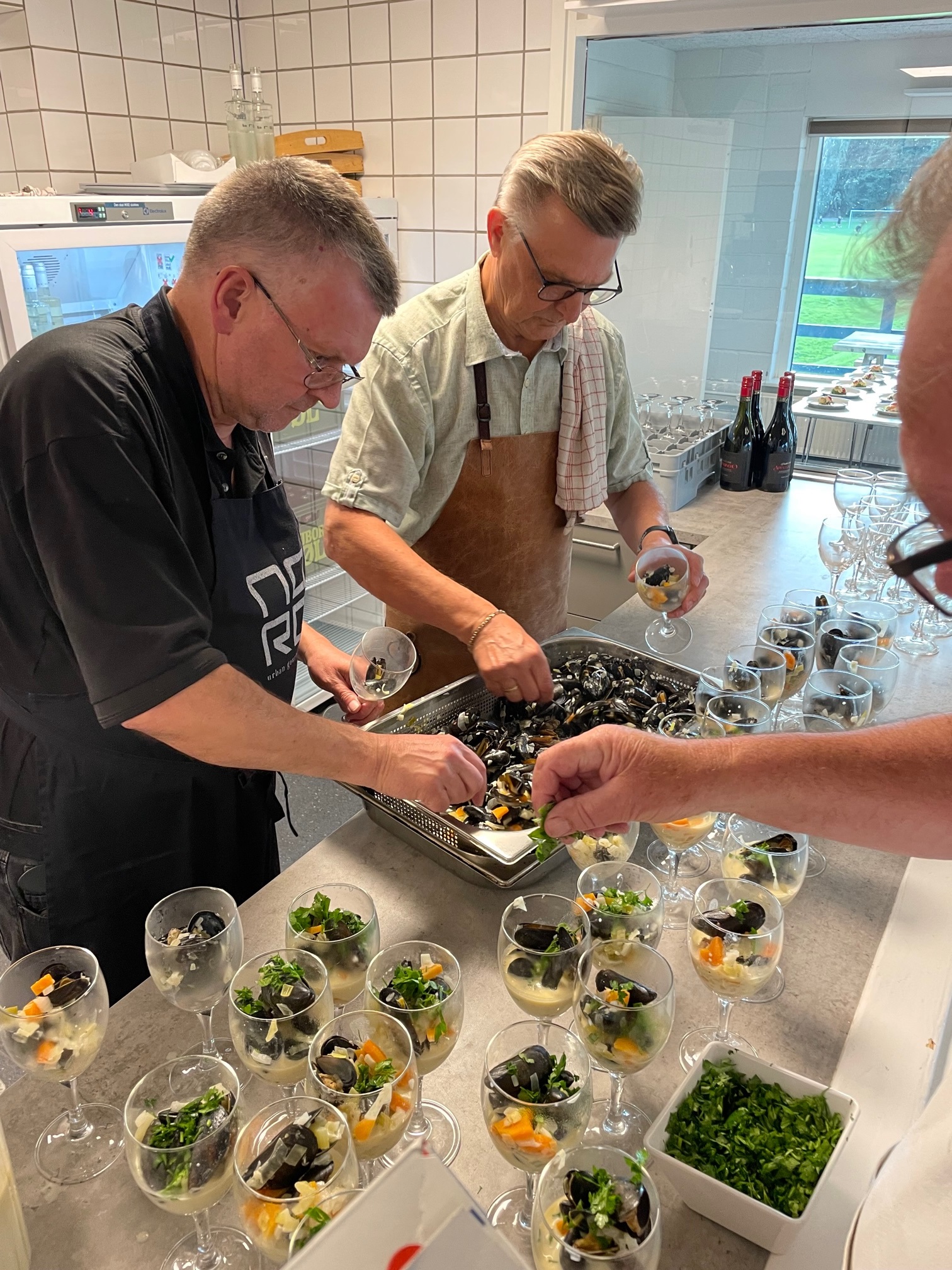 Apropos mænd og kokke-hierarkiske manøvrer, så blev der også serveret dampede blåmuslinger i urter og fløde. Her blev flere gode Gadbjergborgere udfordret på smagsløgene, kan vi vist godt afsløre. Flokken fik dog fortalt, at blåmuslinger indeholder så mange gode næringsstoffer, at man næsten kan leve udelukkende af denne ene råvare - og dermed kan de smagsløgsmæssige udfordringer jo godt forsvares.