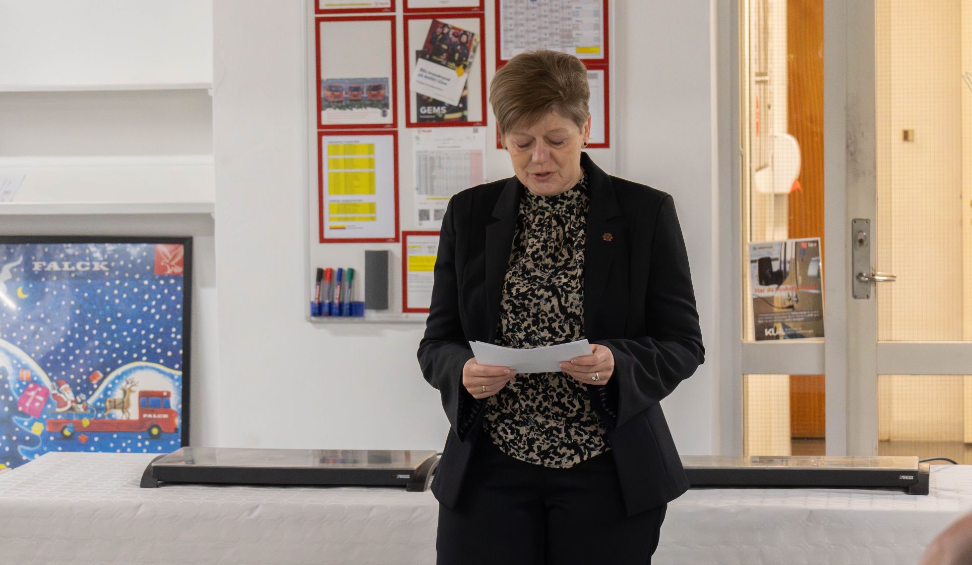 Gerda Jørgensen fra Vejle Kommunes beredskabskommission roste brandstationerne i kommunen for et godt og stærkt samarbejde. Foto: Jim Hoff