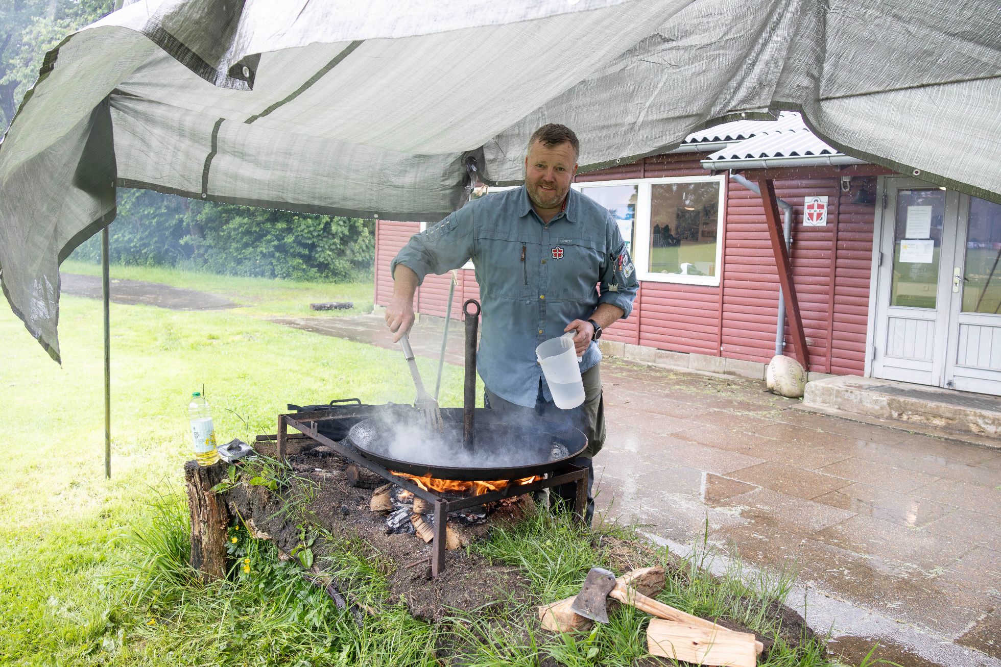 Nuvel, man er vel FDF’er, så man slår naturligvis ikke op i banen. Der bliver spillet spil, fortalt masser af røverhistorier, kløvet brænde, forberedt til bålmad, og en lille gruppe er taget på tur op til bålhytten i kanten af skoven. Det kan godt være, det står ned i lårtykke stænger, men evnen til det sociale og til at hygge sig, kan regnen ikke skylle væk.