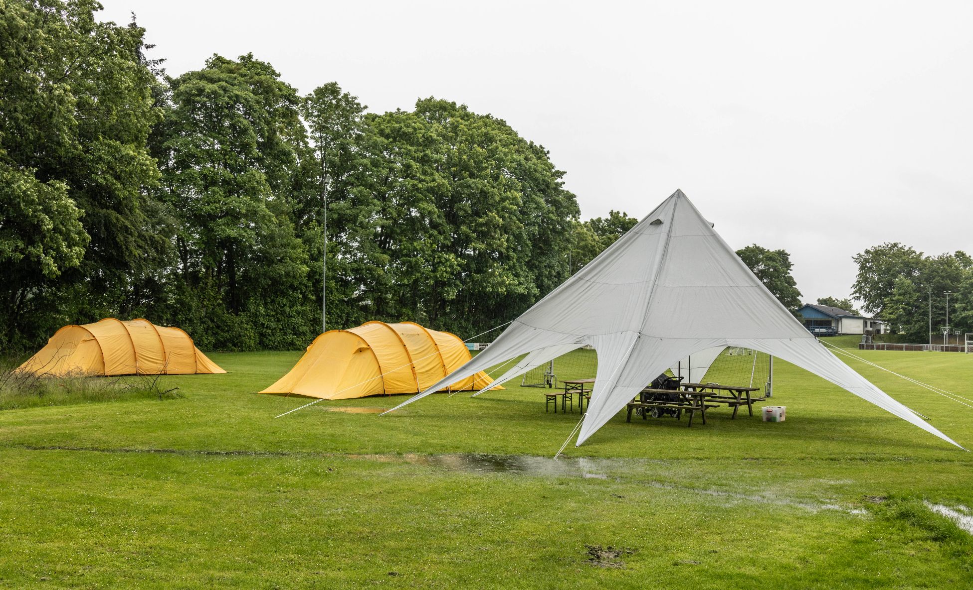 Lørdag nat måtte overnatningen i teltene på græsset foran Kernen aflyses, da vandet trængte ind i teltene. Foto: Jim Hoff