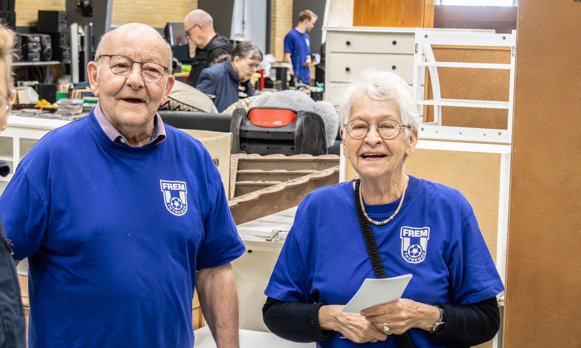 I år kom der en 10-15 helt nye unge kræfter til som hjælpere ved loppemarkedet. De to herlige mennesker her har været unge i mange år og taget en tørn ved loppemarkedet i tæt på en menneskealder. Foto:Jim Hoff