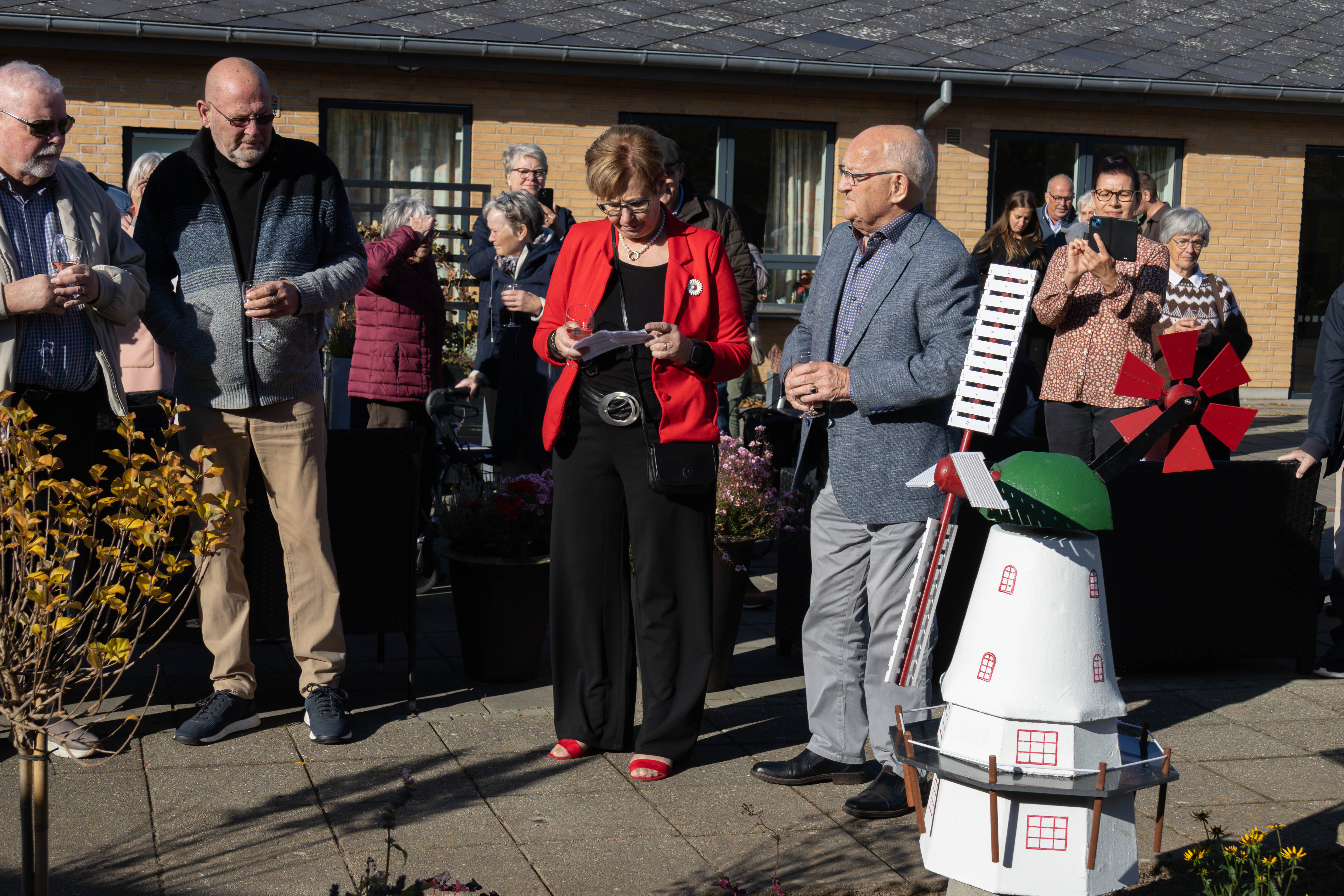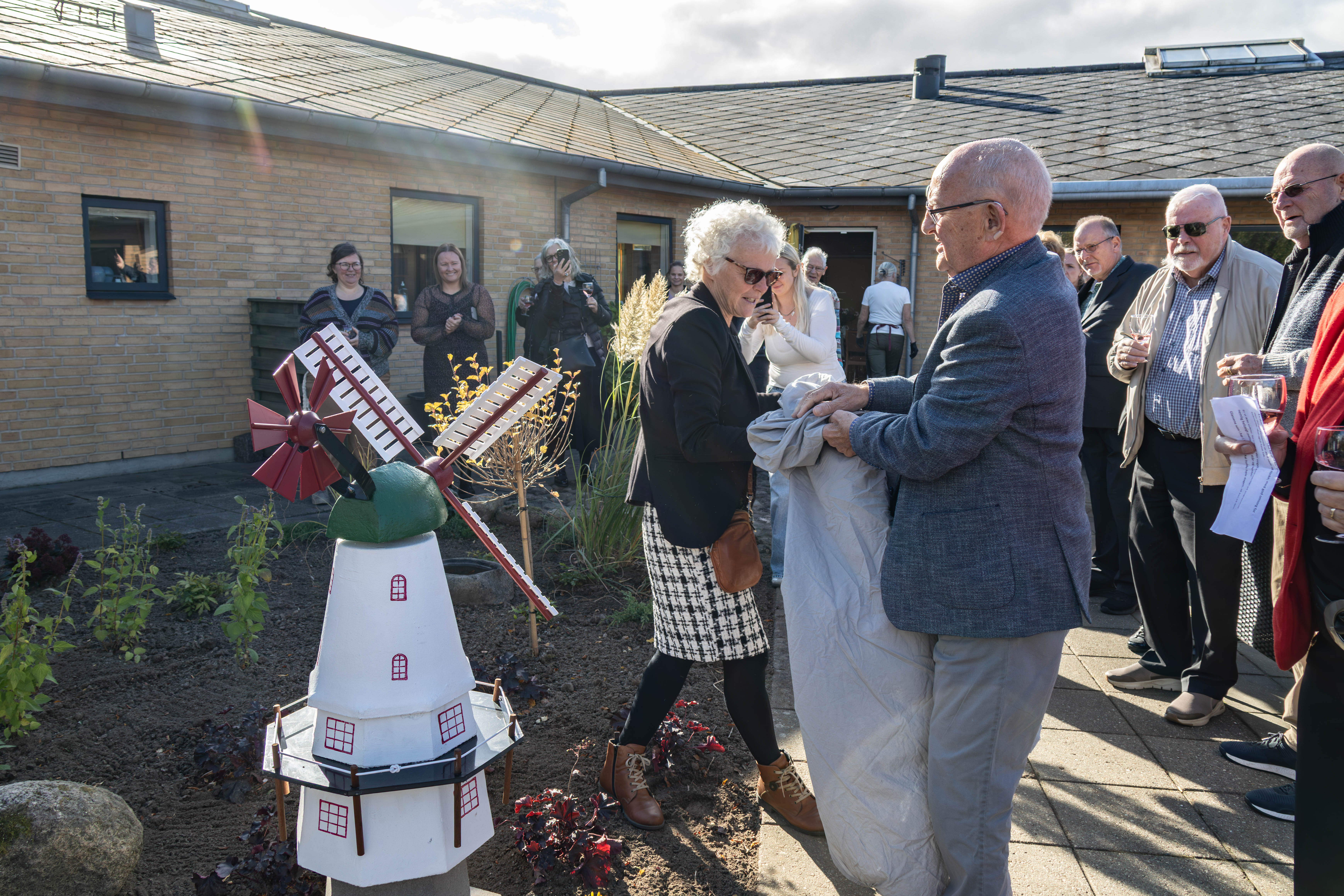 Derefter kunne Kaj så tage tæppet af én af to ’hemmeligheder’, der skulle afsløres på dagen. Det var en flot sten med påskriften ’Sansehaven er skænket af tidligere Toyota-forhandler Kaj Schnorr’, og hemmelighed nr. 2, som Kaj også fik æren af at trække det store lagen af, var en flot vindmølle i træ skænket af Husrådet i Hus 12 som en anerkendende gestus til Kajs donation – og endnu et fint element til elementer, der kan pirre sanserne.