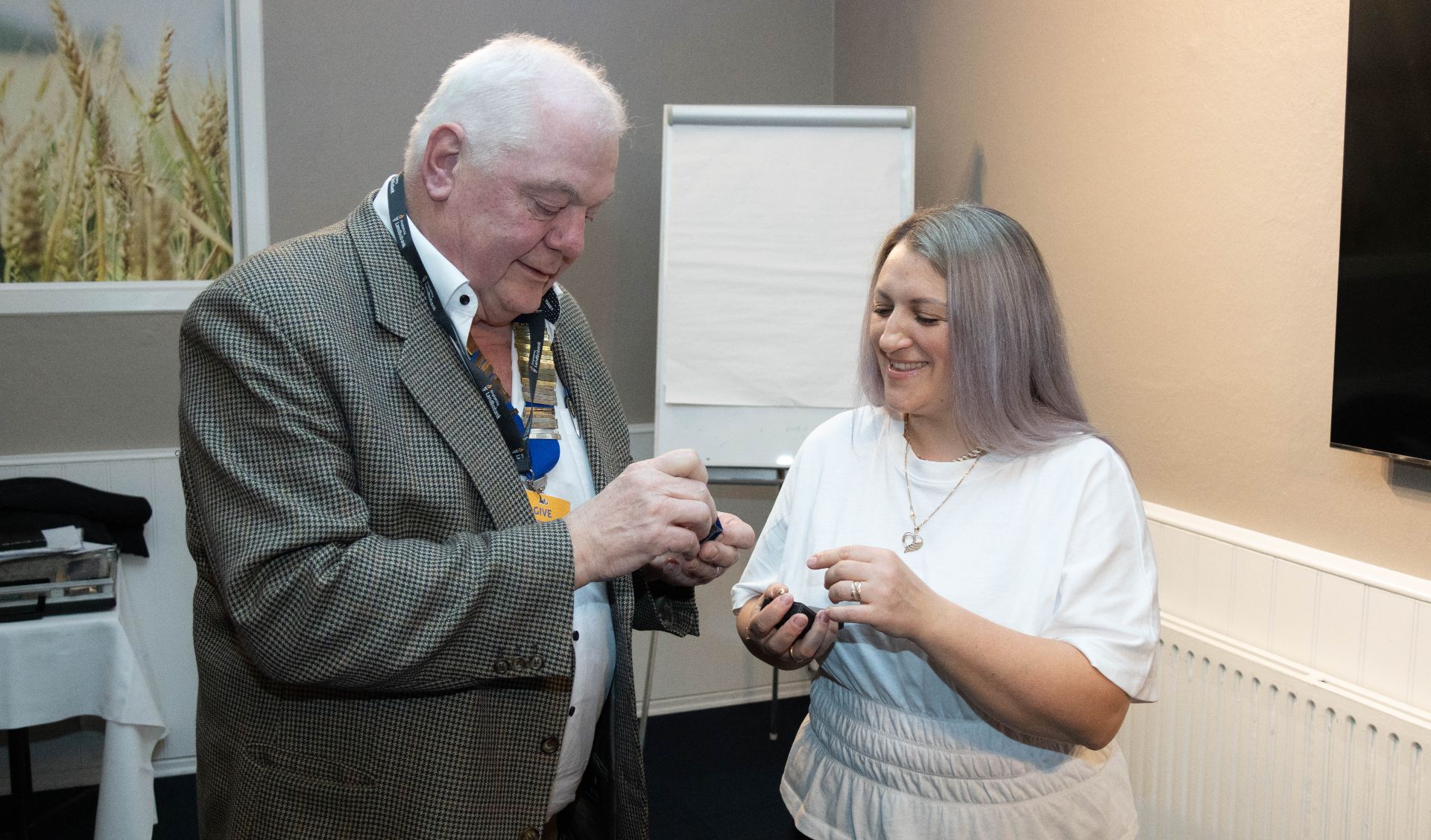 Rotarys præsident, Børge Larsen, viser her Anna Larsen PHF-emblemet- og kort efer var hun den stolte indehaver af emblemet. Foto: Jim Hoff