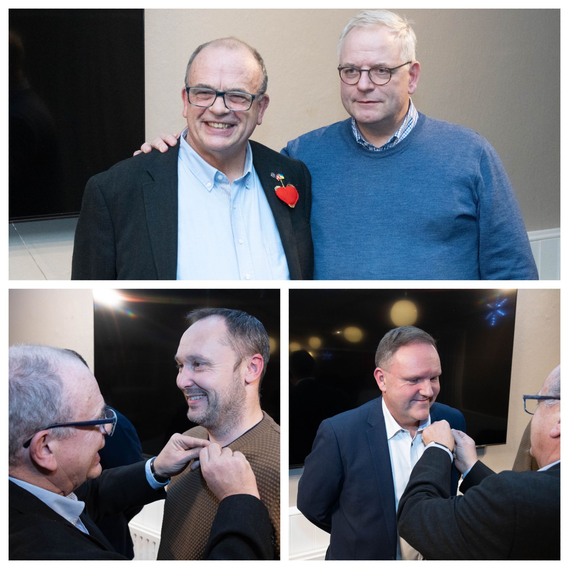 Først var det Brian Kristensen og Benny Kirkeby, der fik deres emblem. Brian for sit flotte arbejde med de to fine og særdeles populære bøger om Give og omegns historie, og Benny for sit glimrende arbejde med Rotarys lotteri.