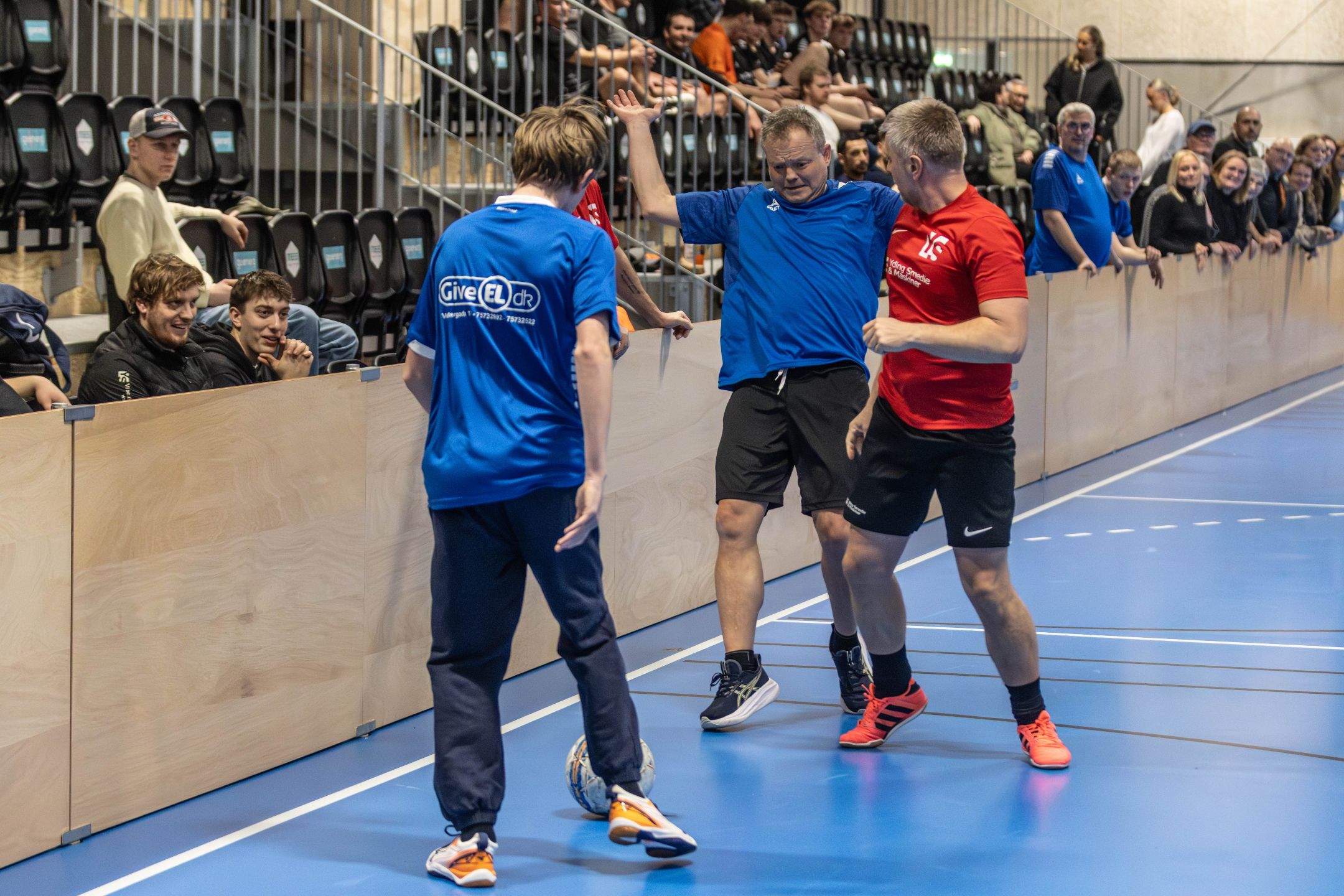 Foto: Stemningen var helt i top både inde på banen og på tilskuerrækkerne, da der den 28. februar blev afholdt firmafodboldstævne med 28 hold i Give Idrætscenter. Foto: Jim Hoff