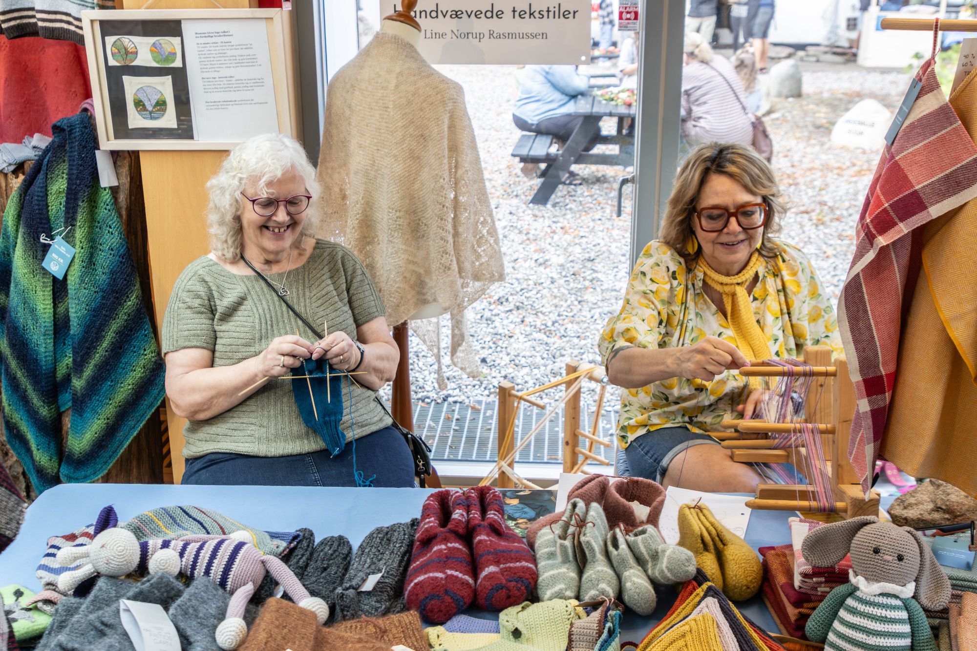 Museets strikkeklub var på plads både med et par hyggelige strikkedamer og en masse af de fine ting, de har lavet hen over sæsonen. Foto: Jim Hoff