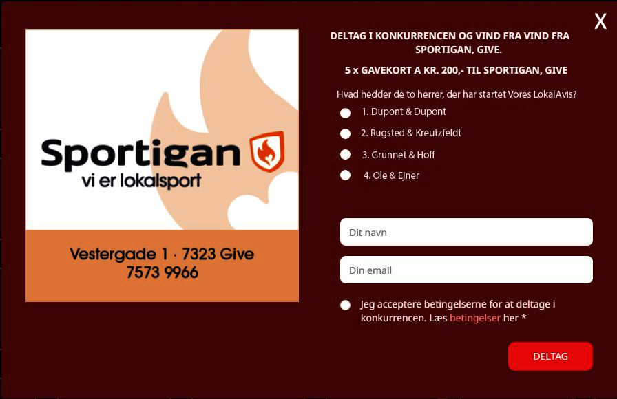 Når vi rammer 1. december er Vores LokalAvis klar med en rigtig sjov juleleg i form af en online julekalender. Her har gode butikker og erhverv i Give og omegn sponsoreret gaver for over 28.000 kroner, som du kan vinde blot ved at besvare spørgsmål af lokal karakter.