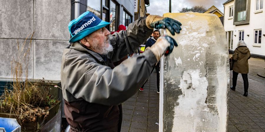 Foto: Den lokale multikunster Knud Buhl var en del af det stærke internationale kunstnerselskab, der forvandlede isblokke til kunst ved den 10. udgave af Isskulpturfestivalen i Give. Og han brillerede som altid med et underfundigt budskab i sit værk. Foto: Jim Hoff