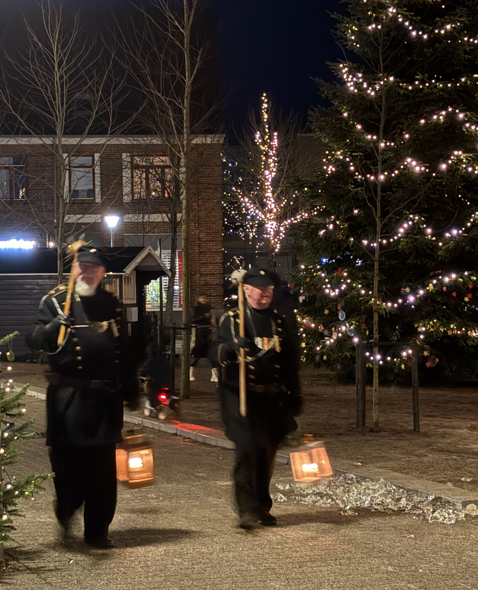 Foto 4: Vægterne dukkede op i bymidten ved mørkets frembrud og var med til at skabe en rigtig herlig aftenstemning da folk gik ud på gaderne for a beundre isskulpturerne i mørket. Foto: Hanne Lund
