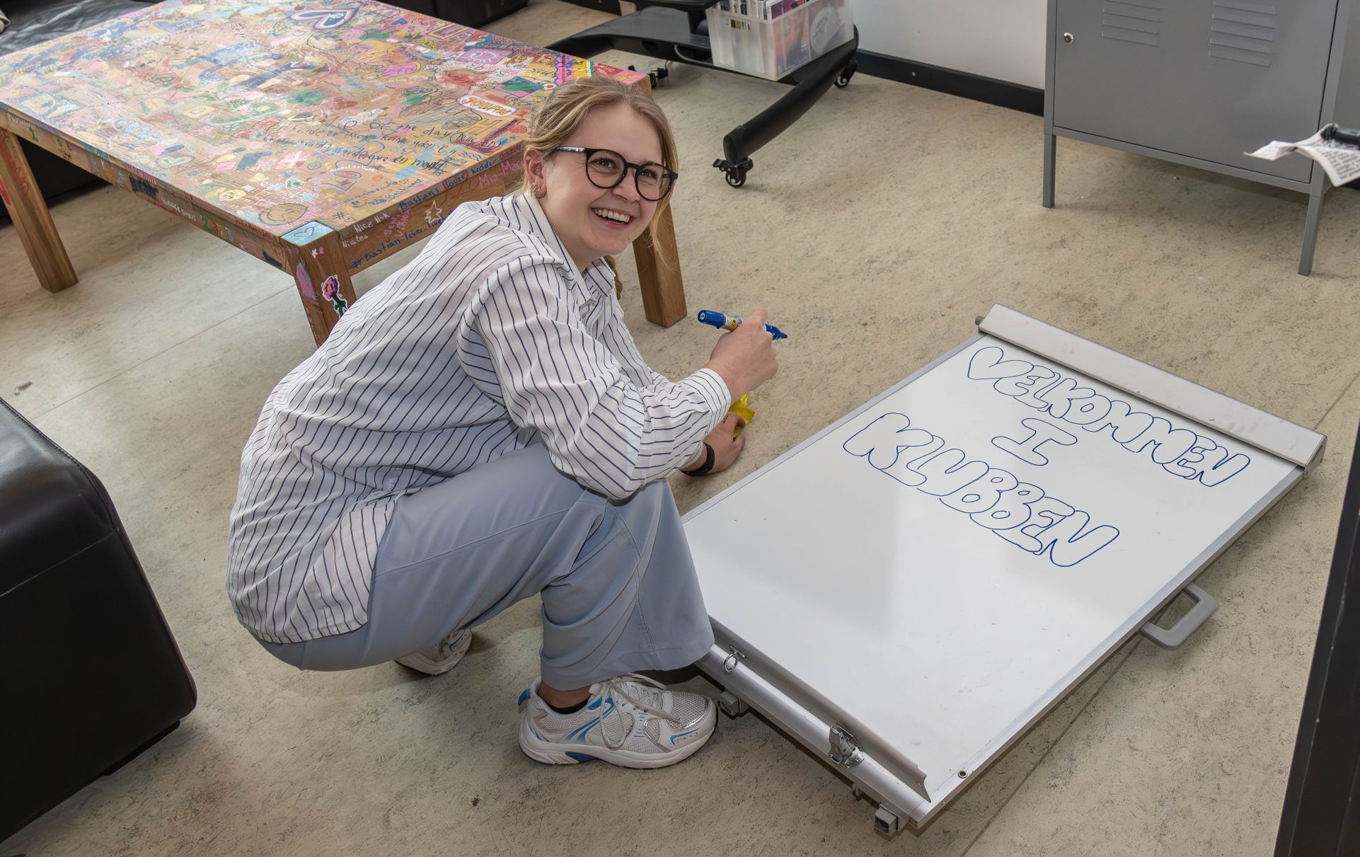 Julie fik æren af at skrive velkomstskiltet til den allerførste klubaften i det nye setup. Og det var hun god til, som vi ser her. Foto: Jim Hoff