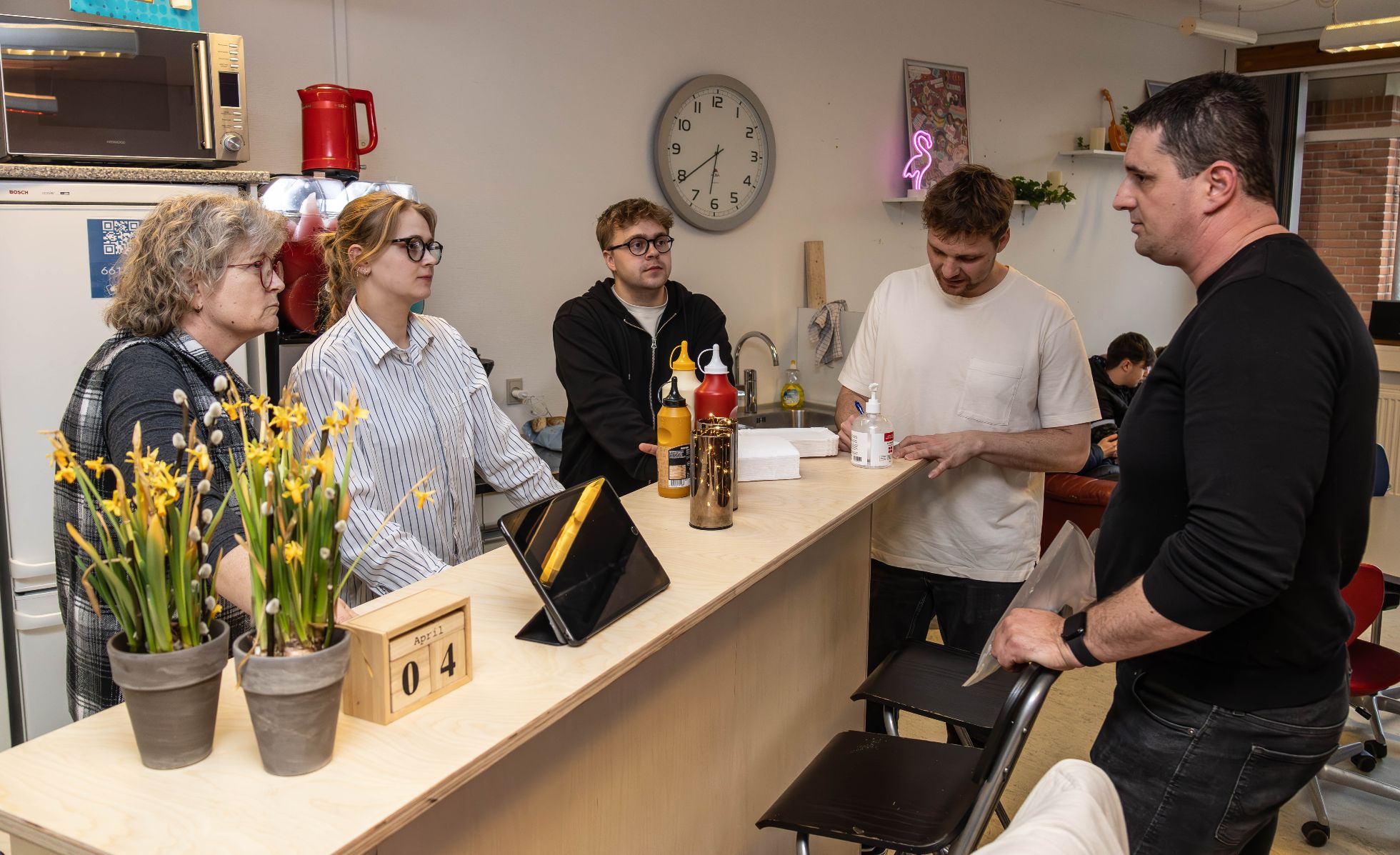 Normalt er det Jakob Norlyk, der star med forklædet og tryller de blege tulipstænger om til livssaliggørende frankfurtere med det hele. Men Jakob har travlt, for lederen for klubber og fritidscentre i Vejle Kommune, Srdjan Popovic, er nemlig dukket op med en flot gave til det nye setup på ‘Ground Zero’: En splinterny mikroovn, og her er det Jakob, der med vanlig håndværkersnilde baner vejen og får den placeret det rigtige sted.