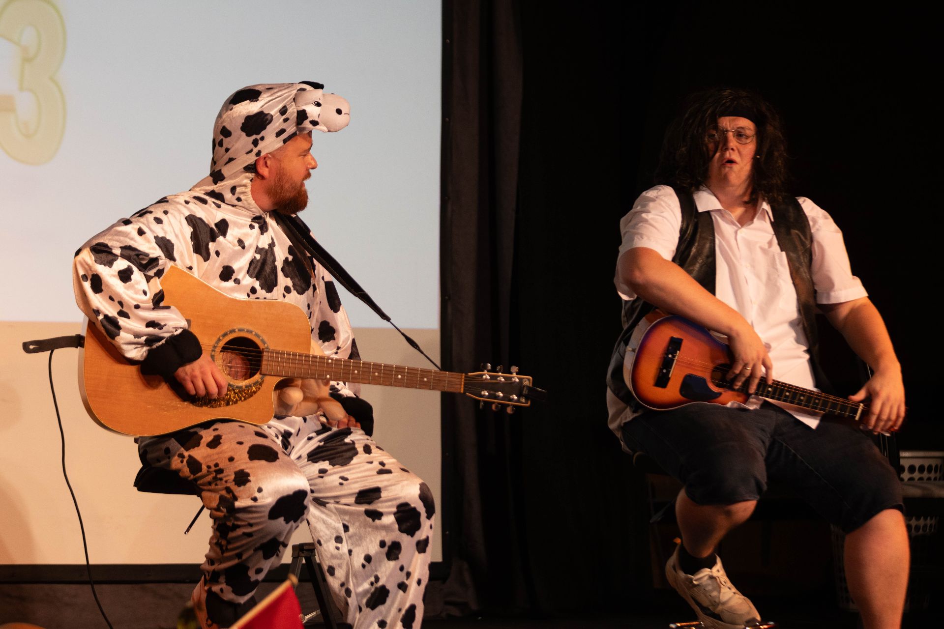 Det er Peder Skjærlund, Kaj Grove og Anders Børresen, der har leveret tekster til revyen, og revyholdet har også selv været leveringsdygtige på den konto. Det er Louise Timmermann og Henrik Højgaard, der har titlen som instruktører, men som de begge konstaterer med brede smil, så er hele holdet generelt inde over med massevis af input og gode råd.