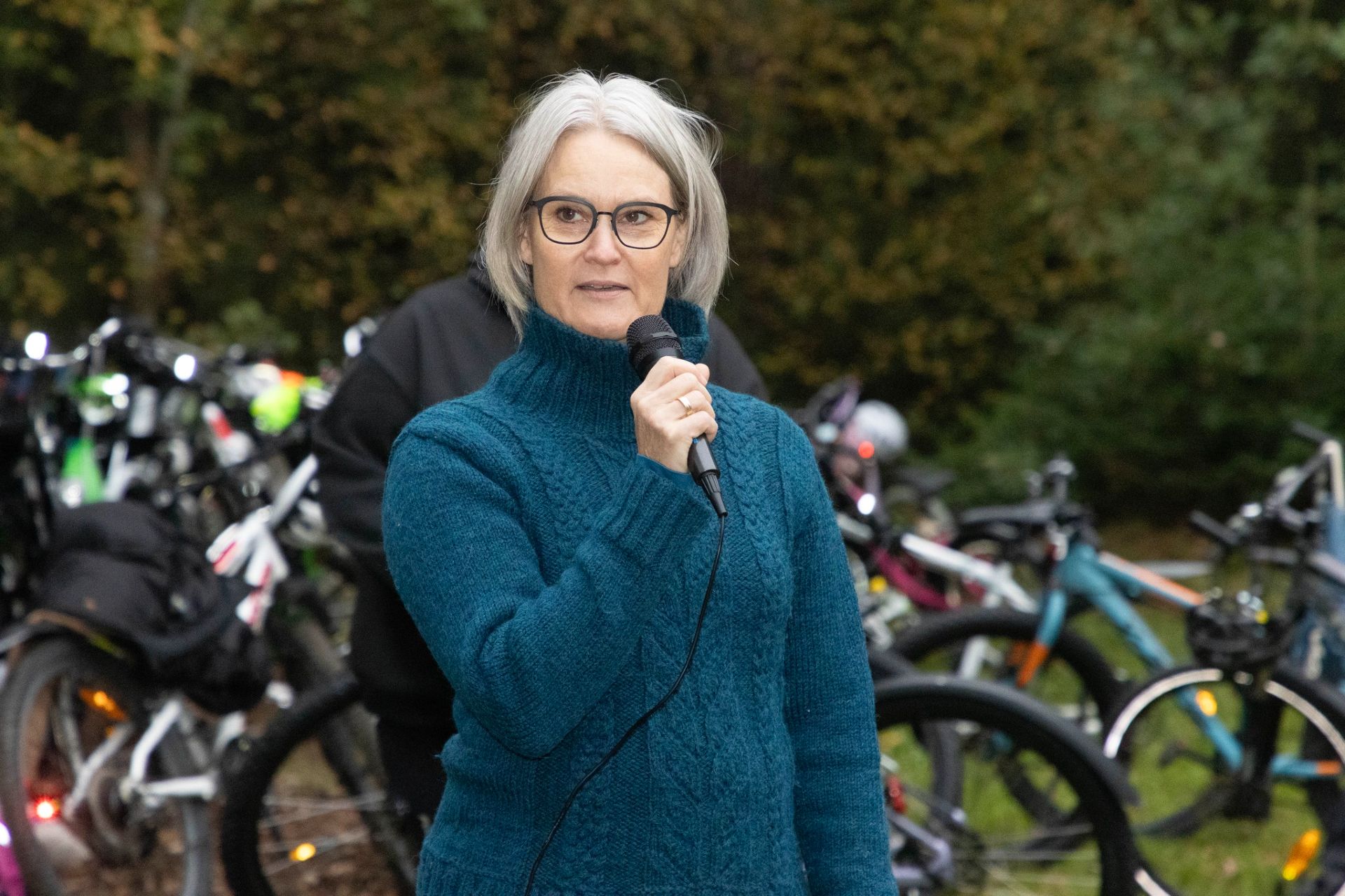 Skoleleder Jette Bech Mathiesen fortalte om sin store glæde ved at skolen fastholder traditionen med at afholde motionsdag i Give Plantage. Foto: Jim Hoff