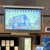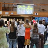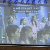 Og så går det løs oppe på storskærmen. Vi skal lige gennem 2 sange, inden jublen for alvor bryder løs i fællesrummet på friskolen. Her annoncerer dagens vært, Solaf Masoud, efter at alle har sunget klassikeren ’Jeg ved en lærkerede’, at ”vi meget apropos lærken nu skal høre ”17 Verdensmål”, en sang fra Karlskov Friskole, som handler om, at vi skal passe på vores klode og de dyr og mennesker, der bor på den”.