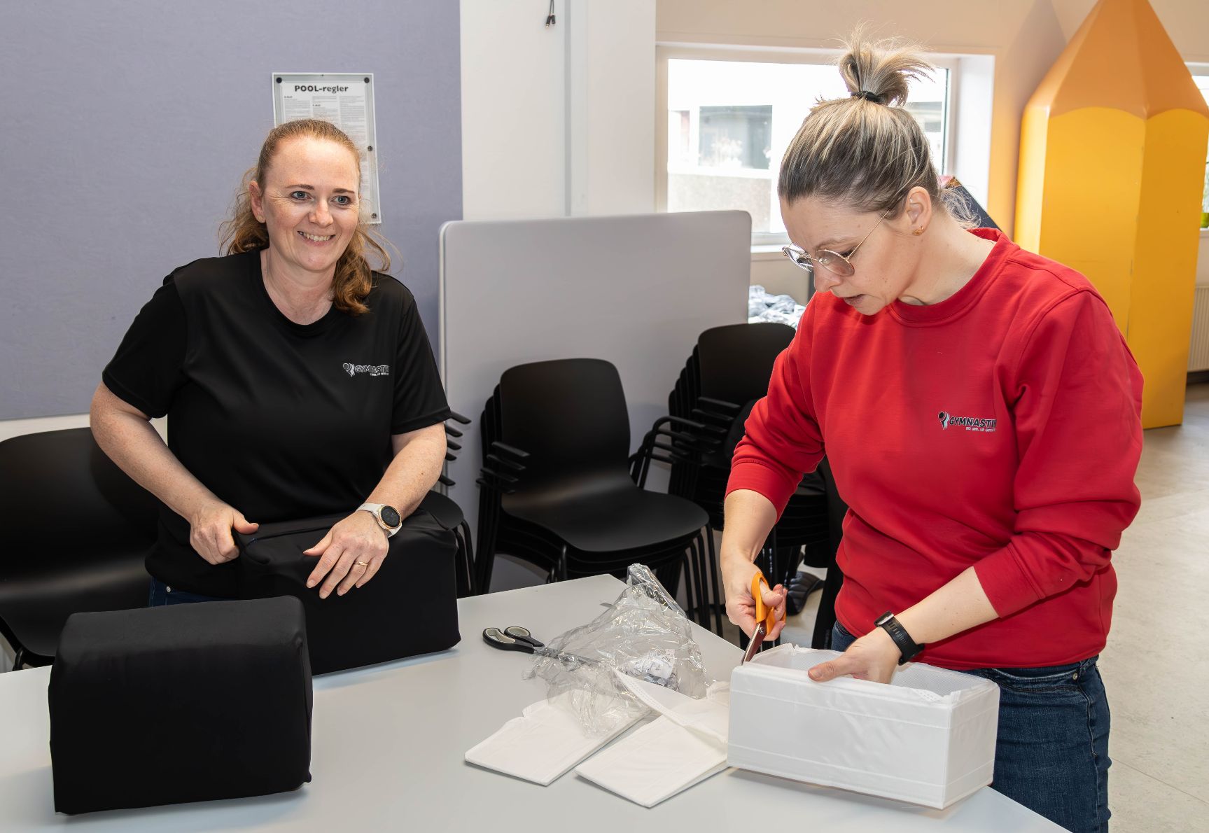 I “presse-afdelingen” møvres skumfiduserne ned i stoffet, og her skal der bruges både muskler og håndelag. Et par af de gode frivillige, har taget deres små børn med på “pommes frittes-fabrikken", og de leger muntert i baggrunden med SFO’ens fine legesager.