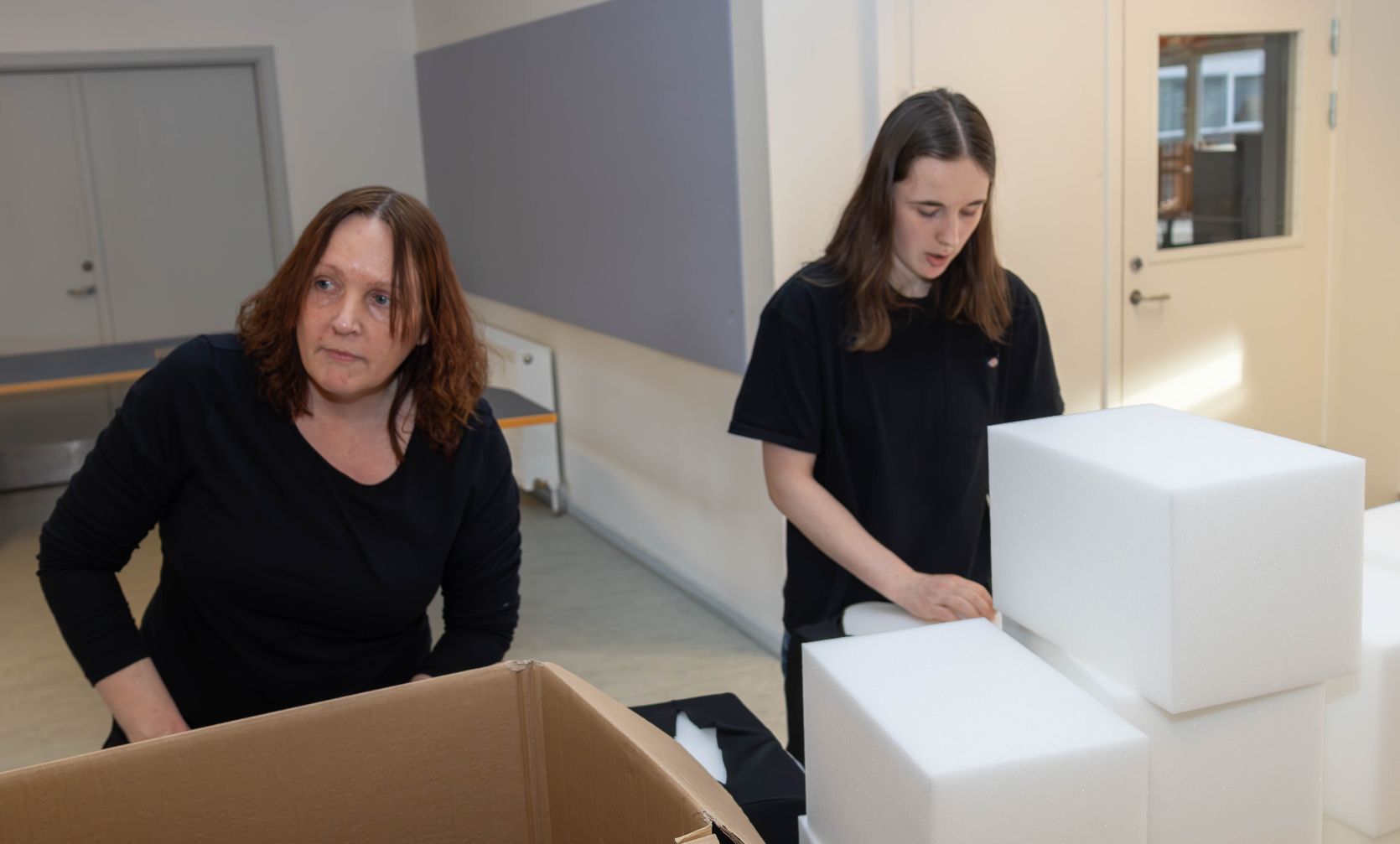 Her er vi i 'presseafdelingen', hvor de udpakkede skumfiduser skal presses ned i nogle "faste rammer". Foto:Jim Hoff