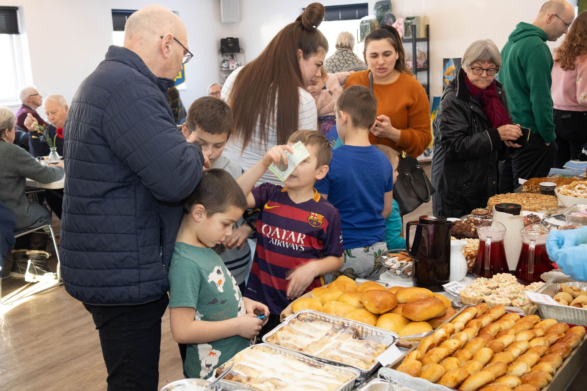 Tilbage til selve velgørenhedsarrangementet, hvor en række ukrainske kvinder havde sørget for et imponerende opbud af mad, og lækkert bagværk i vaskeægte ukrainsk stil og tilsnit. Herligt og både en fryd for øjet og ganen. Naturligvis kunne der tilkøbes kaffe, saft og juice til maden.