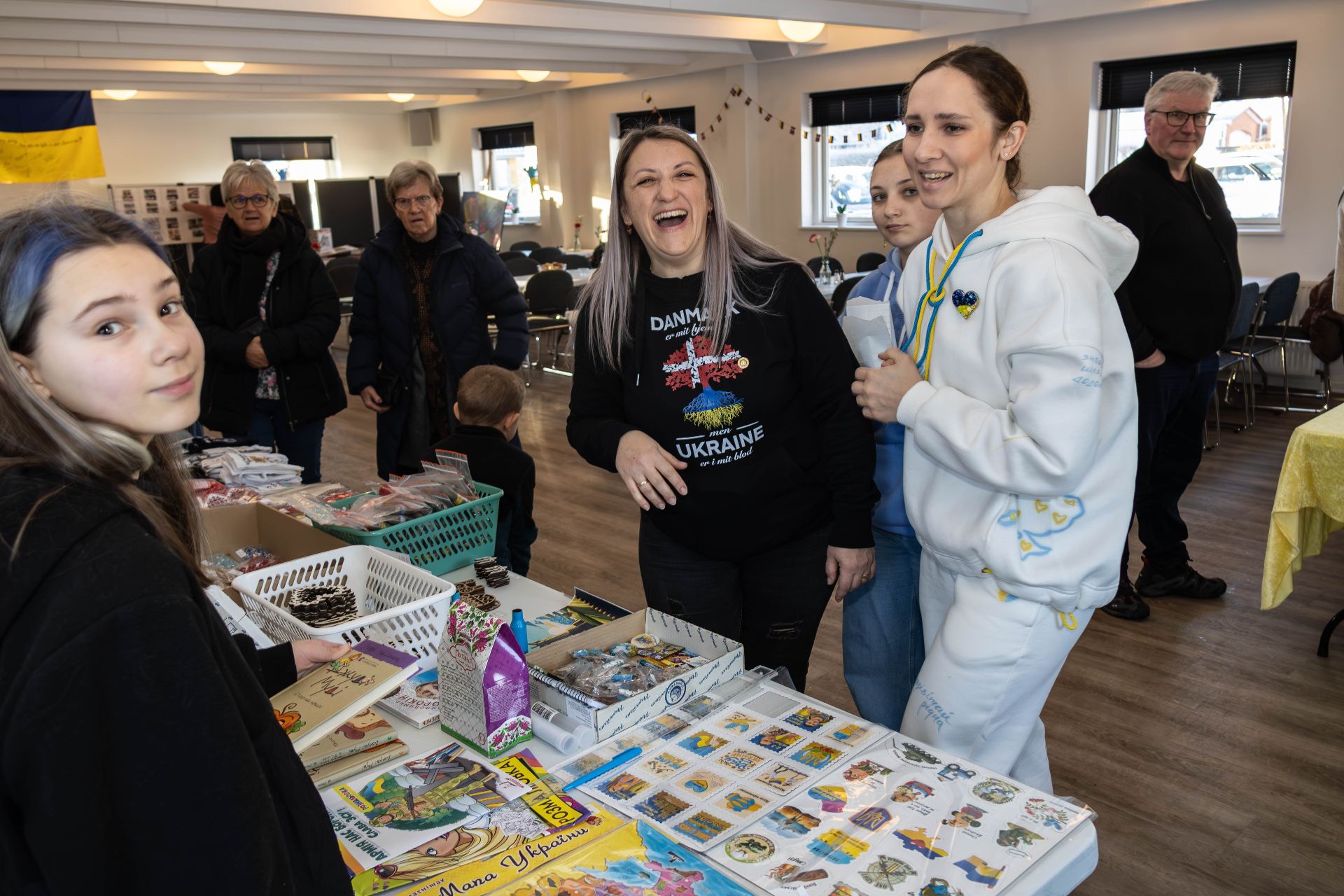 Allerede fra ‘kick-off’ klokken 10.30 var der en flot tilstrømning af folk til multisalen, og det store mad- og kagebord tog bare kegler - både på dansk og ukrainsk side. Der kom hurtigt gang i både boderne og tombolaen, og folk hyggede sig bare rigtig meget sammen på kryds og tværs af nationer, alder og køn. Flere af de ukrainske kvinder var iført smukke ukrainske gevandter, og det bidrog bestemt også til den festlige og hyggelige stemning, hvor en herlig blanding af vestjysk og ukrainsk dannede et fint og autentisk lydtæppe.