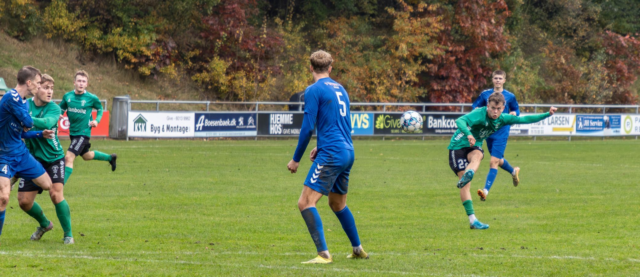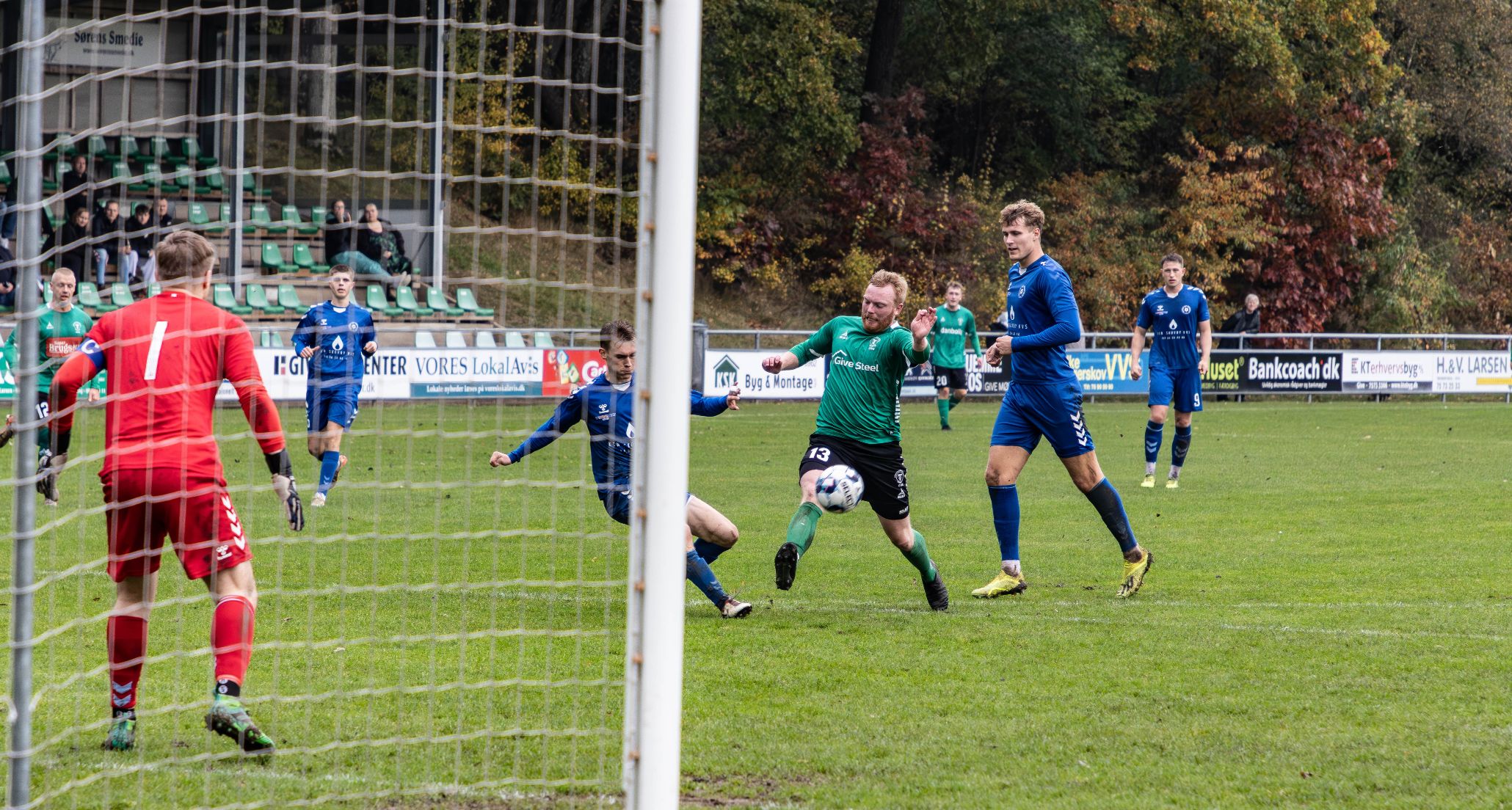 Jonas Østergaard scorer her på et godt skud til 1-4. Og så kom der liv i kampen. Foto: Jim Hoff