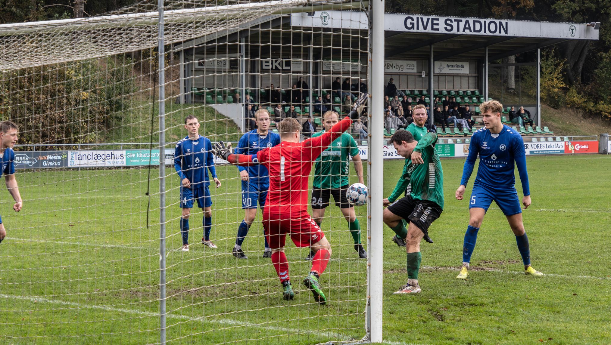Her er det Gives angriber Kristoffer Larsen, der efter 48 minutter er meget tæt på at score for Give, mem igen vra Odders keeper i vejen. Foto: Jim Hoff
