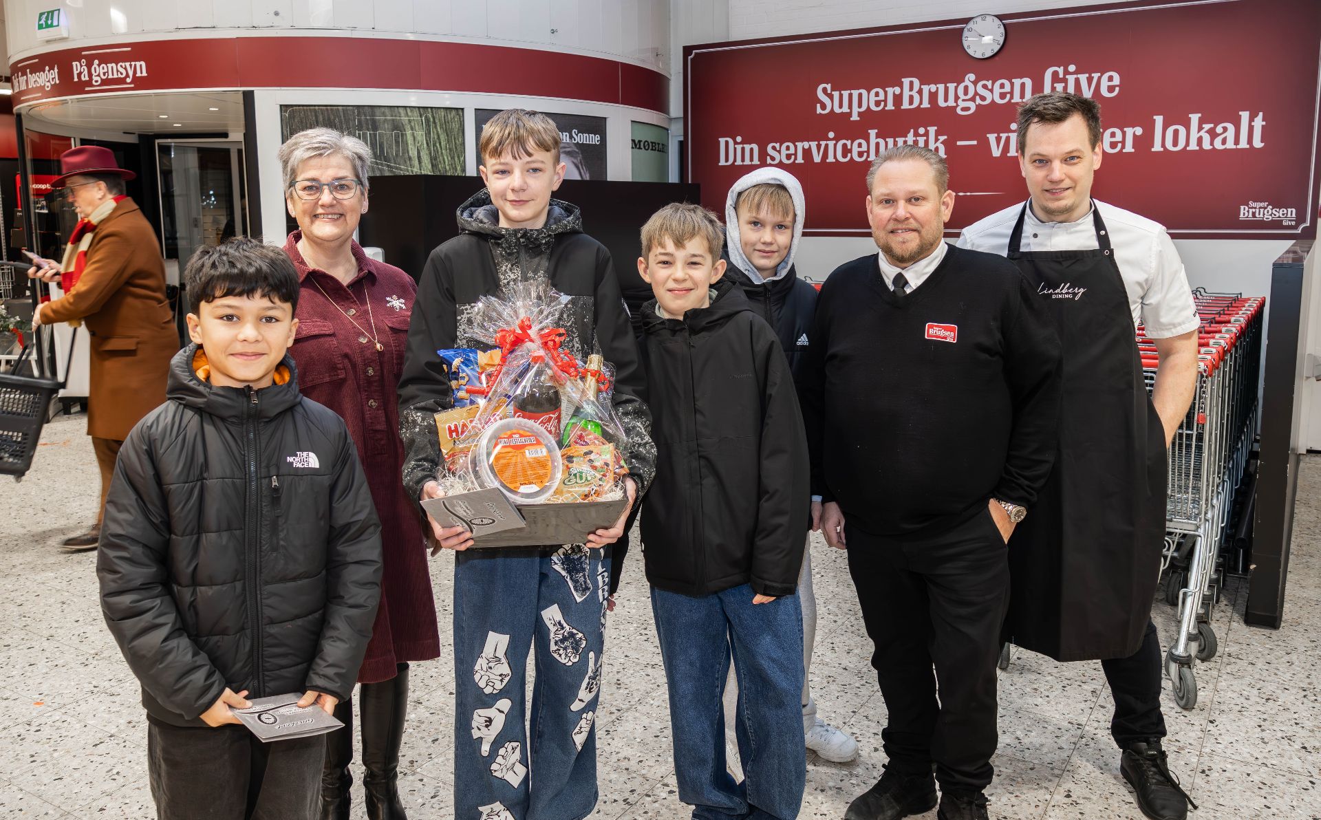 Onsdag formiddag ved 10-tiden var der virkelig gang i den i Brugsen i Give. Her kunne nysgerrige forbipasserende på vej ind i Brugsen møde et større livligt og muntert fremmøde. Og især fire af personerne fik folk til at nikke anerkendende og sige “nå ja, det er jo de der drenge, der reddede den gamle dage fra at omkomme”. Jeps, det var det nemlig!