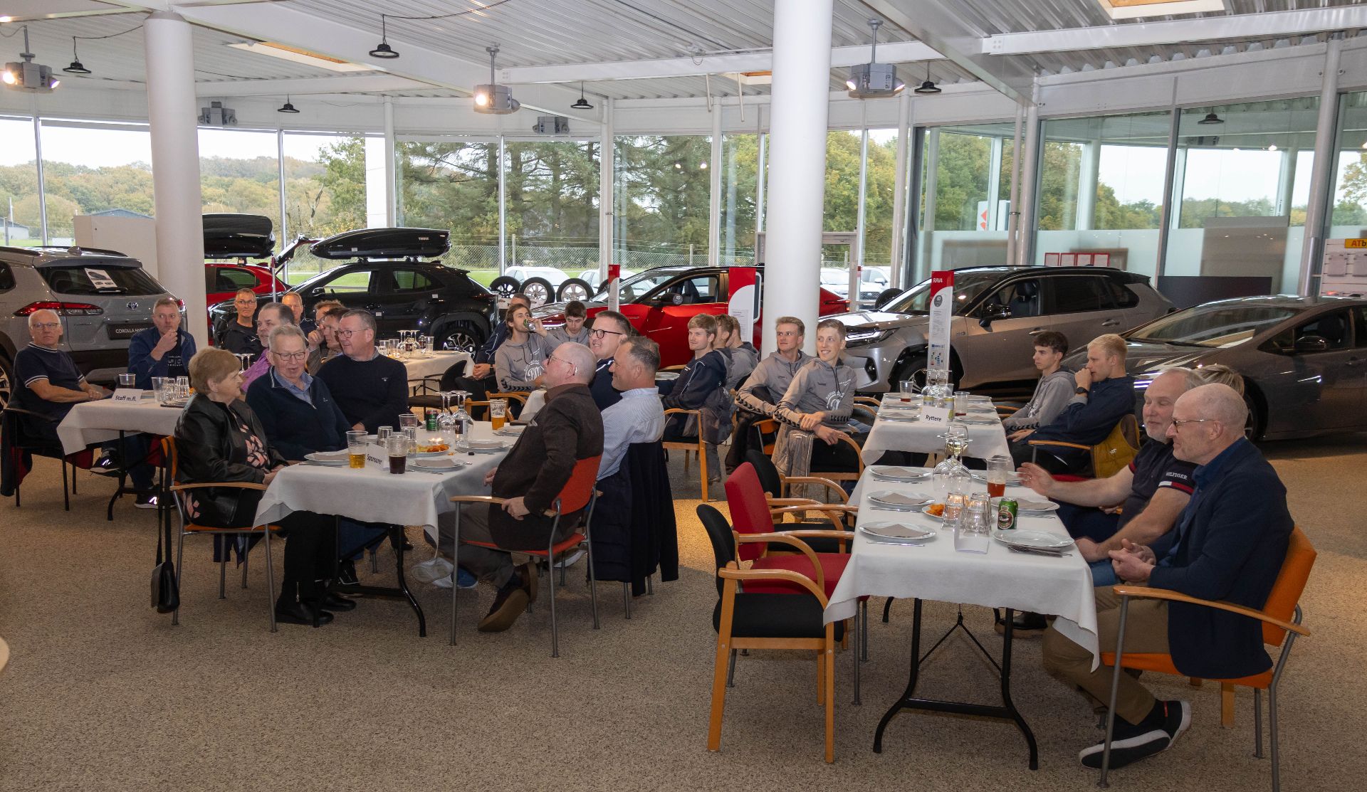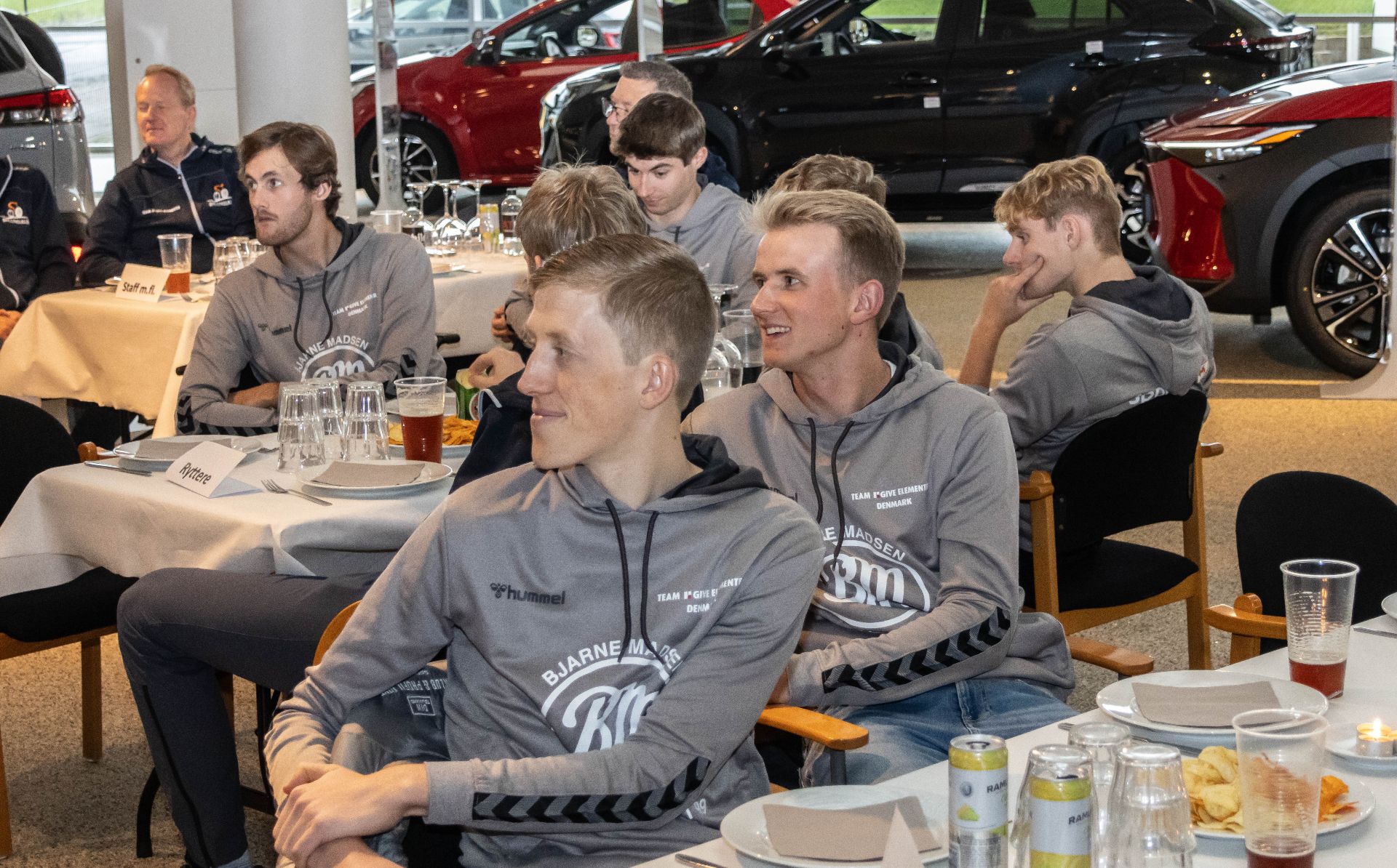- Jeg meldte frisk og frejdigt ud i foråret ved rytterpræsentationen, at vi gik efter 10 podiepladser, og at en 1. plads ville tælle dobbelt i min bog. Ok, en frisk men også realistisk udmelding, det ser vi jo nu, hvor sæsonen er slut. Vi lander på hele fem førstepladser og et hav af podiepladser plus en del top 10-placeringer. Det ender med, at vi faktisk bliver det 4. bedste hold i Danmark målt på pointhøsten. Derudover får vi 3 mand individuelt i top 10, så det er svært at få armene ned, konstaterer Henrik Nielsen, mens holdets sponsorer ankommer og tager plads ved bordene i showroom 1 hos AT Biler, der også er en af holdets gode og trofaste sponsorer.