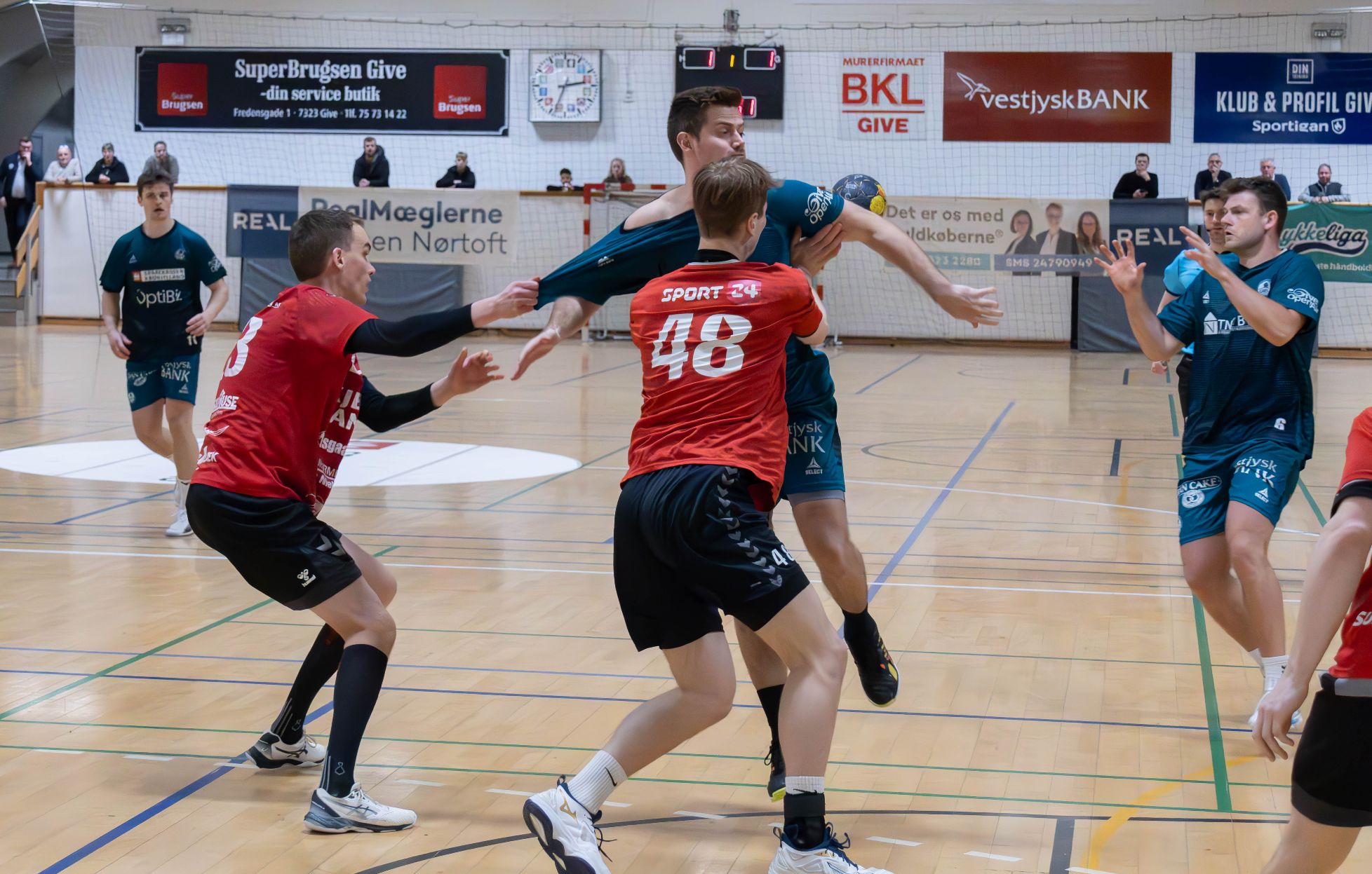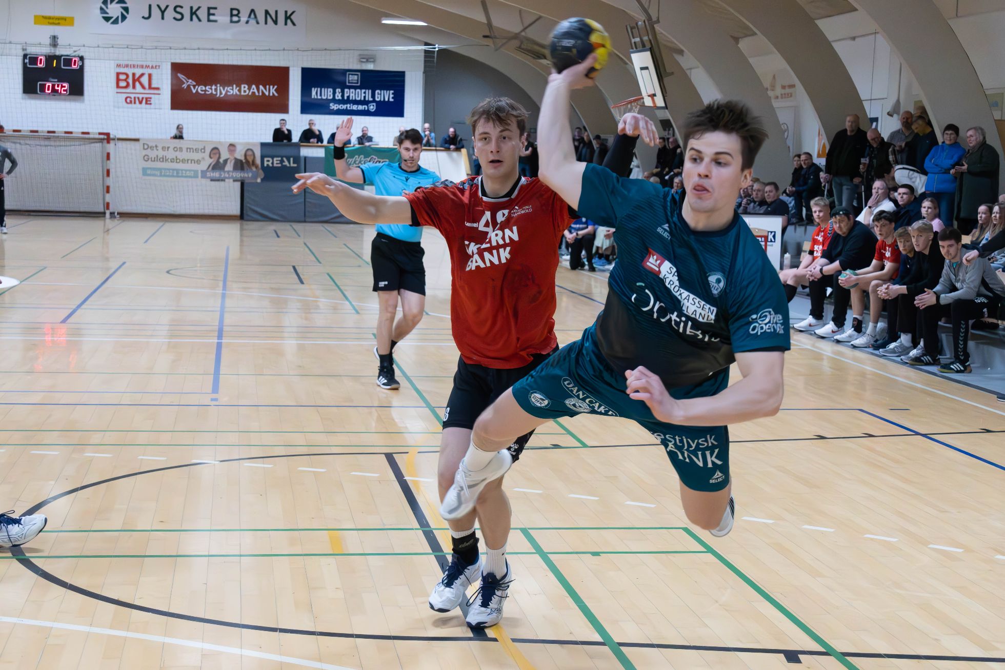 Kampen startede ud i et hæsblæsende tempo, hvor holdne skiftedes til at hagle mål ind i begge ender af banen, Der stod således 3-3 efter fire minutters spil, 8-6 efter et kvarters spil, og efter 5 gode slutminutter inden pausen, kunne Give gå til pause med en 17-13 føring - ikke mindst grundet en aggressiv og pivfarlig Simon ”Bon Bon” Madsen.