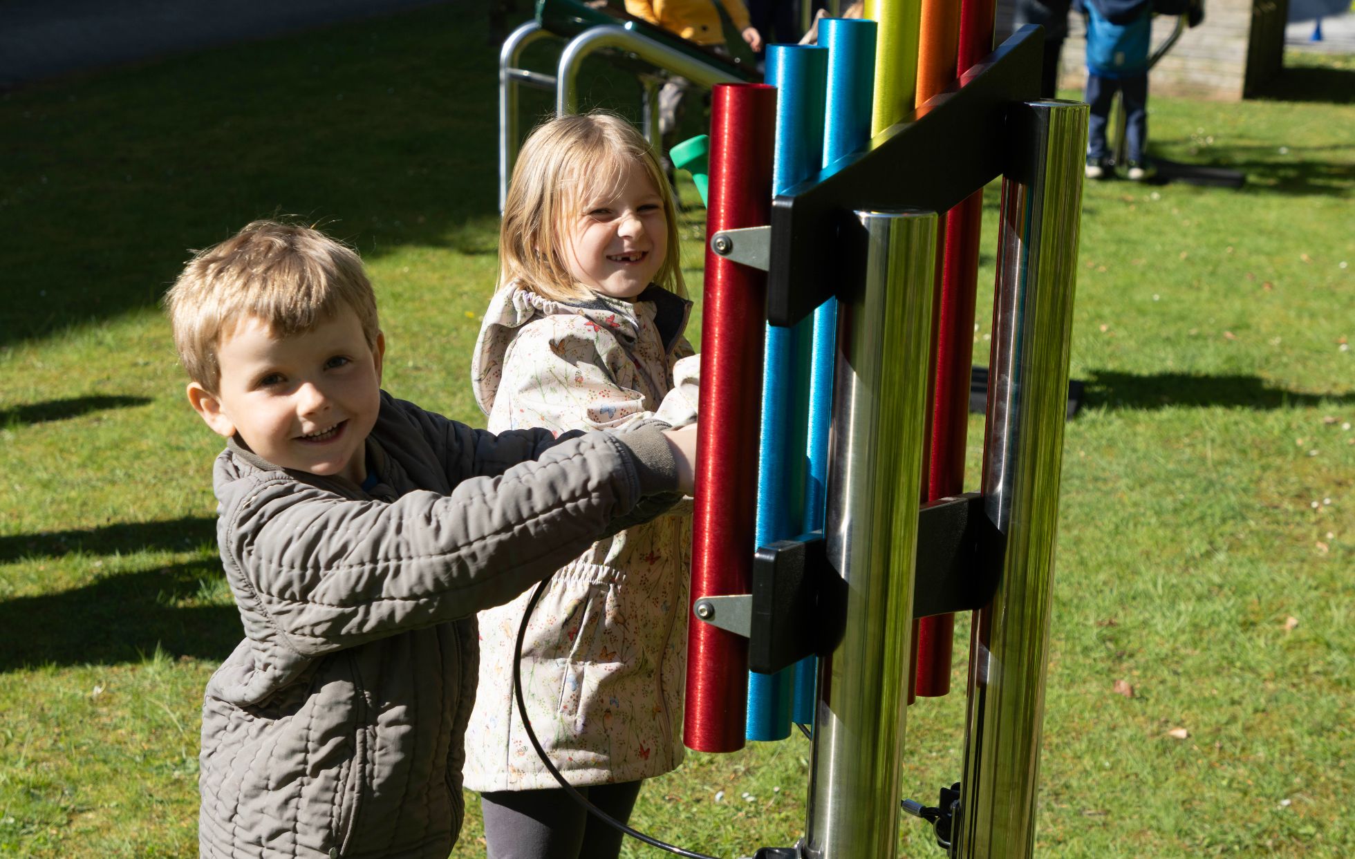 På plænen bag ved Huset var der opstillet en række udendørs musikinstrumenter - og det tog kegler. Foto: Jim Hoff