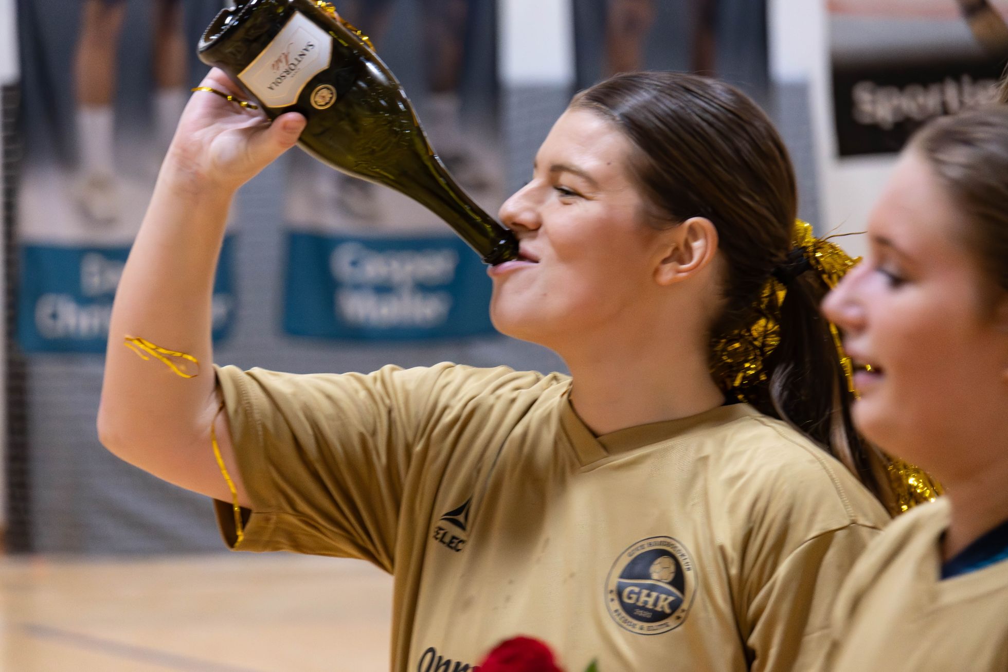 Der blev også udleveret guldparykker, men her kom de unge håndbolddamer på en svær opgave med at få guldhåret på plads oven på egne lokker. Til gengæld skal de have ros for at dele rundhåndet ud af de medbragte champagneflasker, da der først gik hul på dem –og sådan skal det være, når man som sportskvinde kan fejere så flot en triumf som for anden i sæson i træk at rykke op – og det endda i divisionerne.