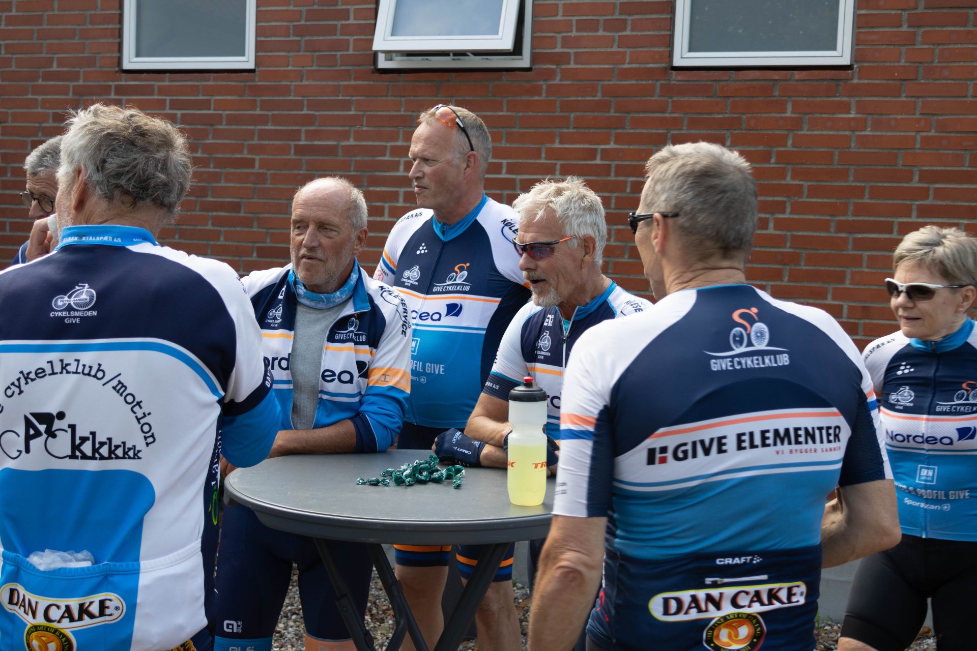 FORENINGSLIV: Det var faktisk et fantastisk syn, der udspillede sig onsdag aften i gårdspladsen bag ved danbolig i Give. Her var ejendomsmægler Lars Secher vært for Give Cykelklubs sommerafslutningsfest – Lars er selv en ivrig cykelrytter og mangeårigt medlem af GCK – og udover de mange ens klædte cykelryttere i stort set alle aldre, var det bemærkelsesværdige aftenens menu.